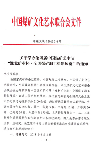 关于举办第四届中国煤矿艺术节“淮北矿业杯•全国煤矿职工摄影展览”的通知