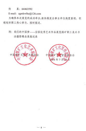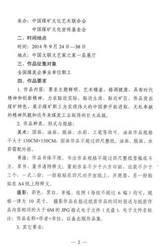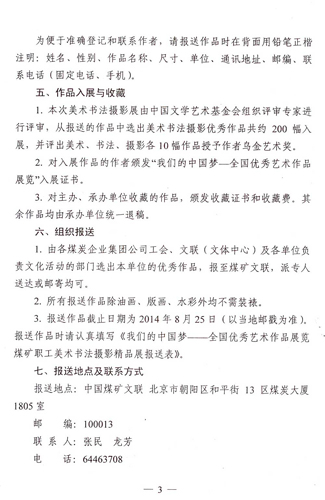 关于举办我们的中国梦——全国优秀艺术作品展览煤矿职工美术书法摄影精品展的通知 来源:中国煤矿文化网 作者: 时间:2014-08-04 【字体:小 大】 附:我们的中国梦——全国优秀艺术作品展览煤矿职工美术书法摄影精品展报送表 分享到: 【打印正文】