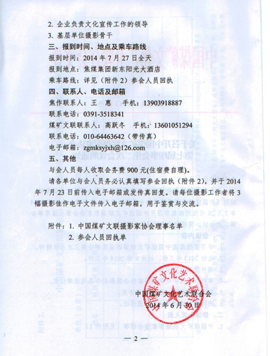 关于召开中国煤矿文联摄影家协会 第七届理事会第二次会议的通知 来源:中国煤矿摄影家协会 作者: 时间:2014-12-23 【字体:小 大】 附件:1.中国煤矿文联摄影家协会理事名单 2.参会人员回执 分享到: 【打印正文】