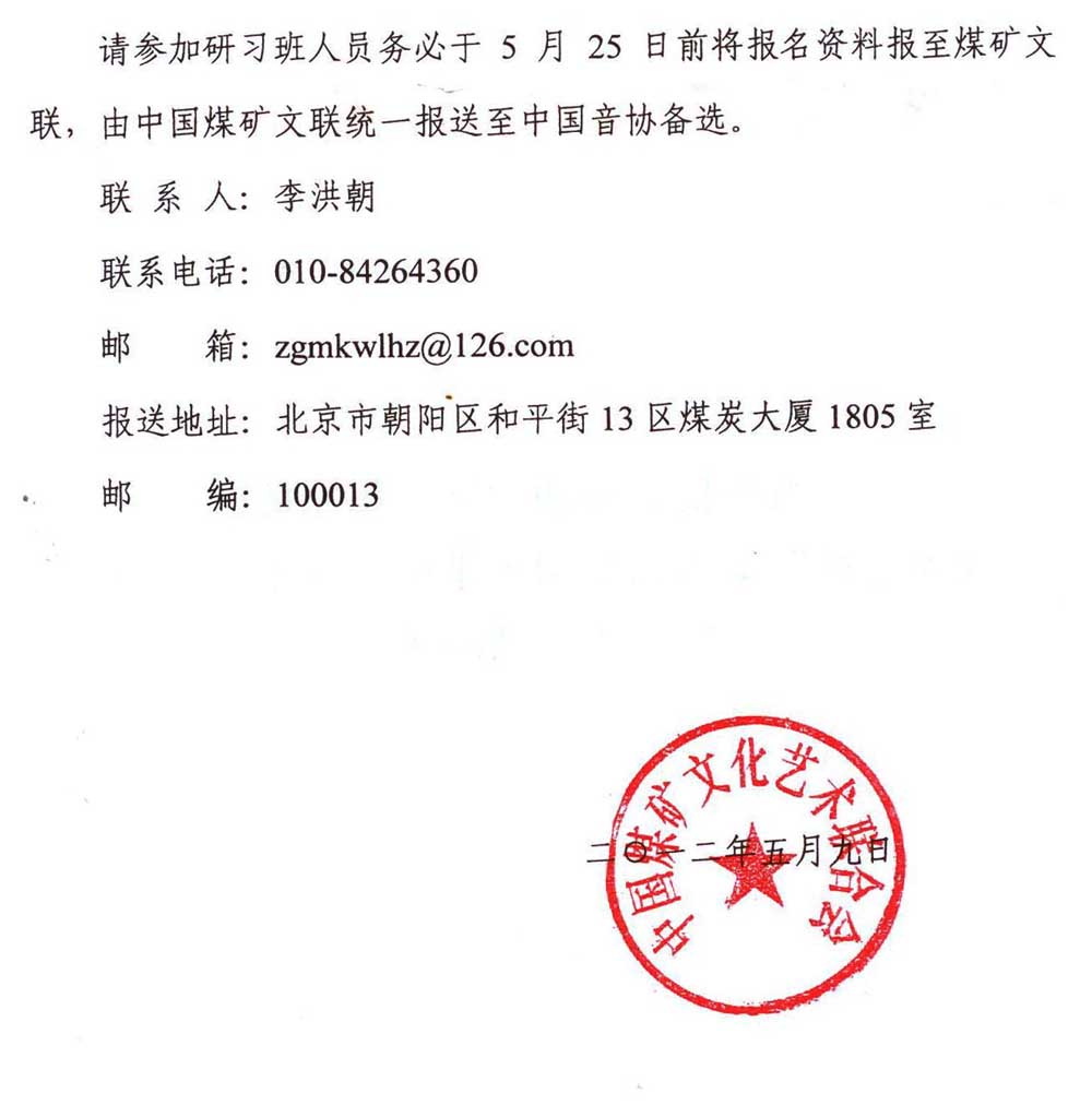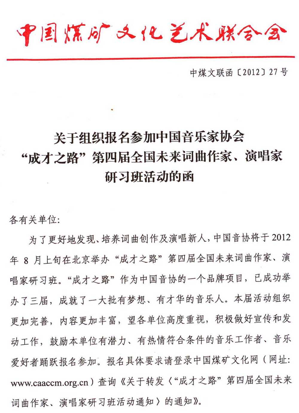 关于组织报名参加中国音乐家协会“成才之路”第四届全国未来词曲作家、演唱家研习班活动的函 来源:中国煤矿文化网 作者:煤矿文联 时间:2012-05-11 【字体:小 大】 附:关于转发《成才之路第四届全国未来词曲作家、演唱家研习班活动通知》的通知 分享到: 【打印正文】