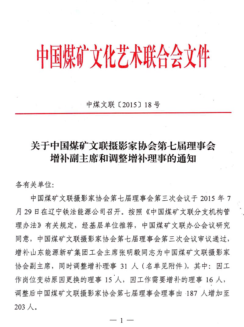 关于中国煤矿文联摄影家协会第七届理事会增补副主席和调整增补理事的通知