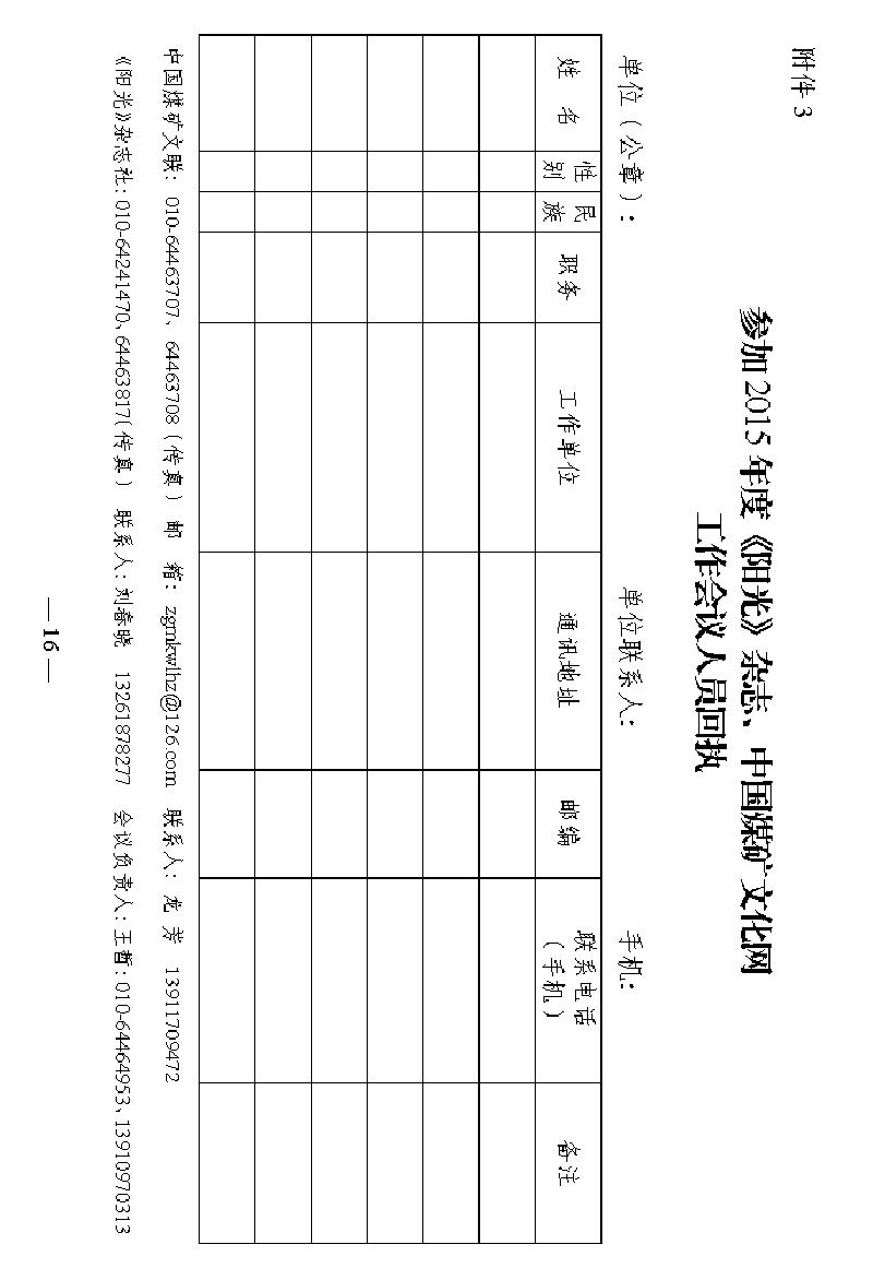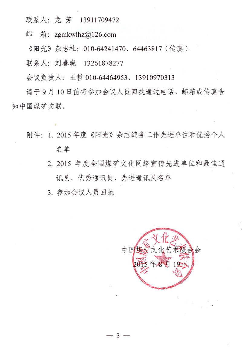 关于召开2015年度《阳光》杂志、中国煤矿文化网工作会议的通知 来源: 作者: 时间:2015-08-21 【字体:小 大】 附件: 1. 2015年度《阳光》杂志编务工作先进单位和优秀个人 名单 2. 2015年度全国煤矿文化网络宣传先进单位和最佳通 讯员、优秀通讯员、先进通讯员名单 3. 参加会议人员回执 智能标签: 阳光 煤矿文化网 相关内容 分享到: 【打印正文】