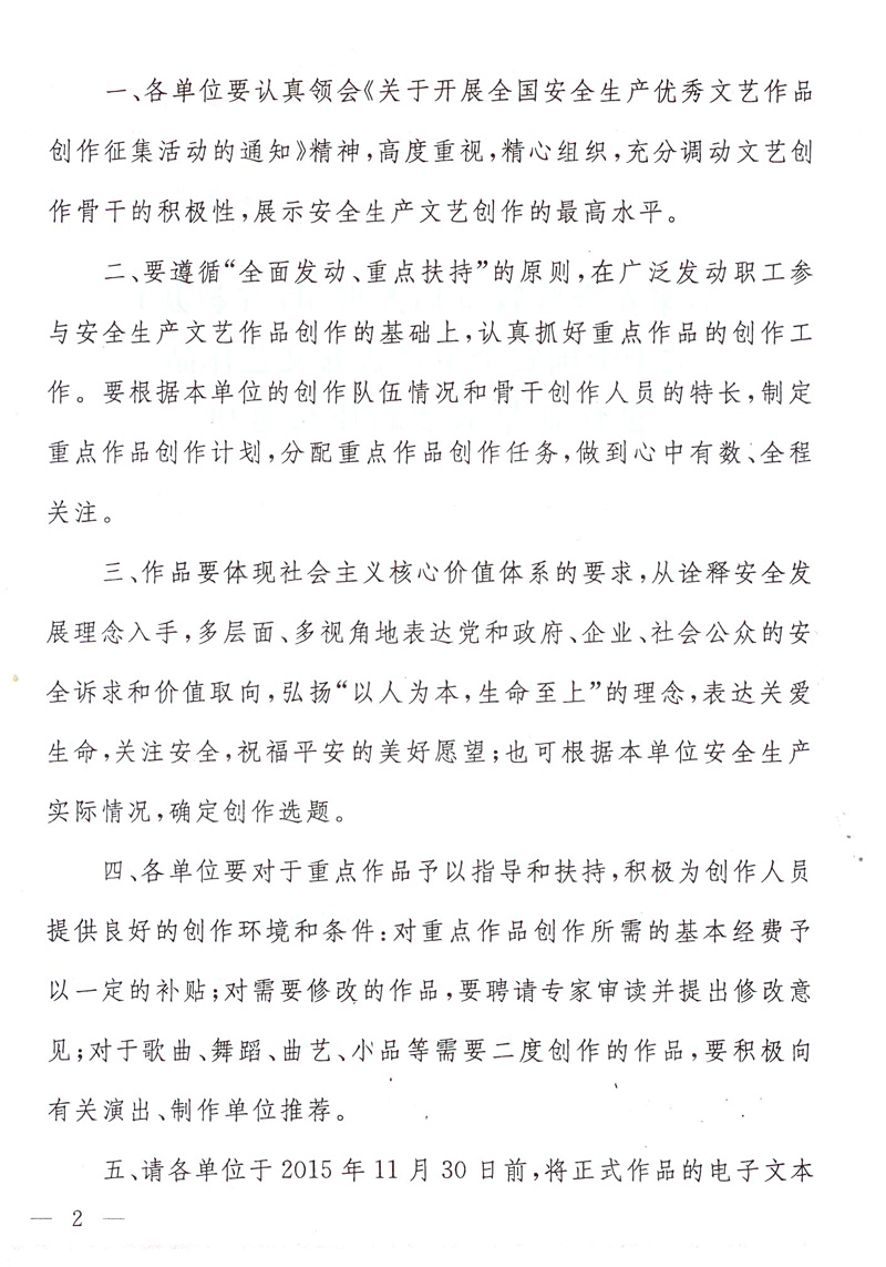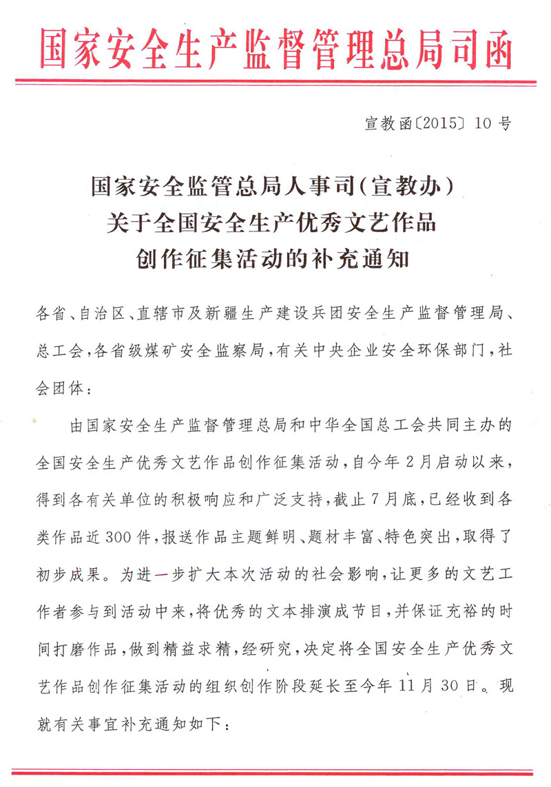 关于全国安全生产优秀文艺作品创作征集活动的补充通知 来源:国家安全监管总局人事司(宣教办) 作者: 时间:2015-09-01 【字体:小 大】 智能标签: 安全生产优秀文艺作品 相关内容 分享到: 【打印正文】