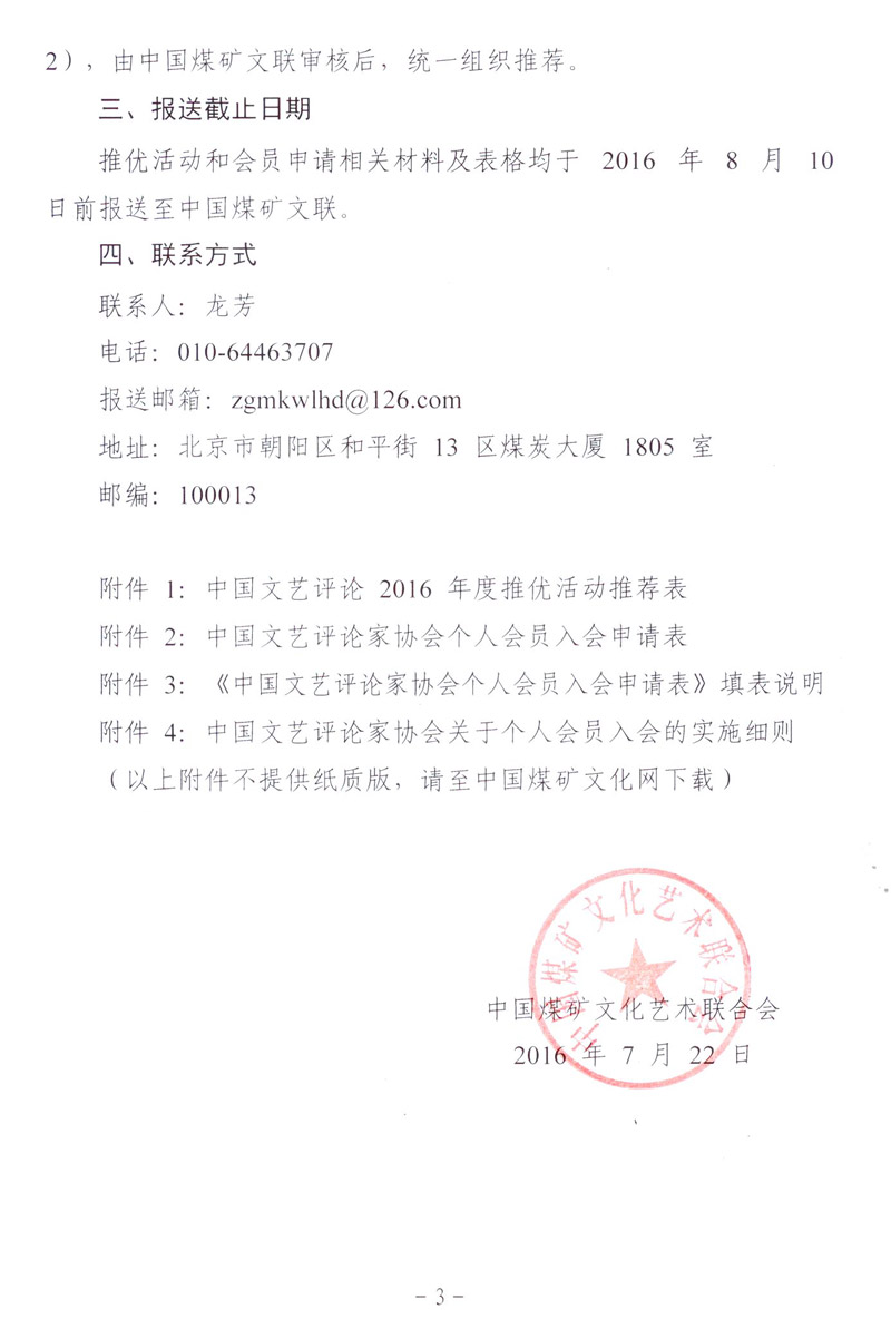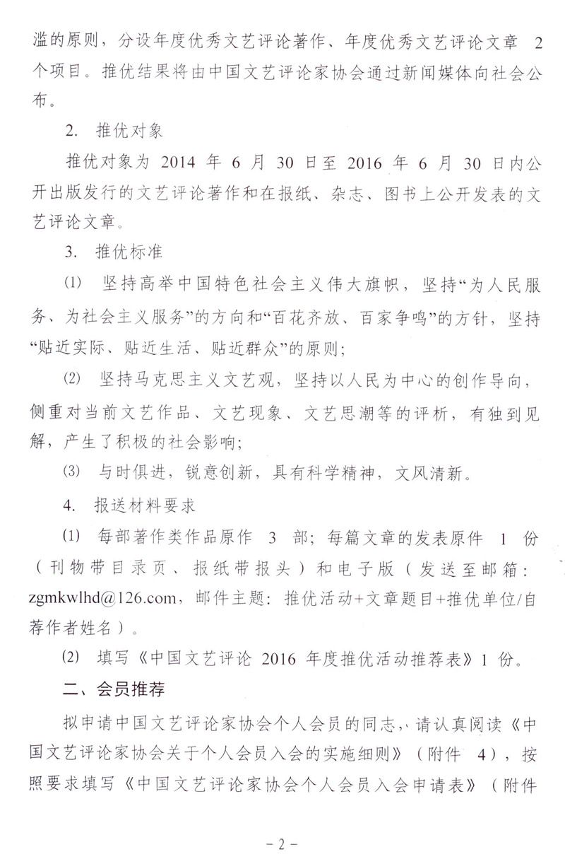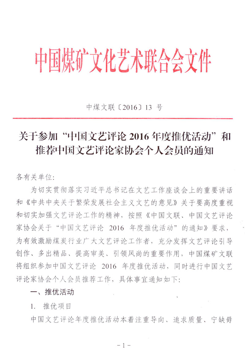 关于参加“中国文艺评论2016年度推优活动”和推荐中国文艺评论家协会个人会员的通知 来源:中国煤矿文联 作者: 时间:2016-07-22 【字体:小 大】 附件1:中国文艺评论2016年度推优活动推荐表 附件2:中国文艺评论家协会个人会员入会申请表 附件3:《中国文艺评论家协会个人会员入会申请表》填表说明 附件4:中国文艺评论家协会关于个人会员入会的实施细则 智能标签: 中国文艺评论 相关内容 分享到: 【打印正文】