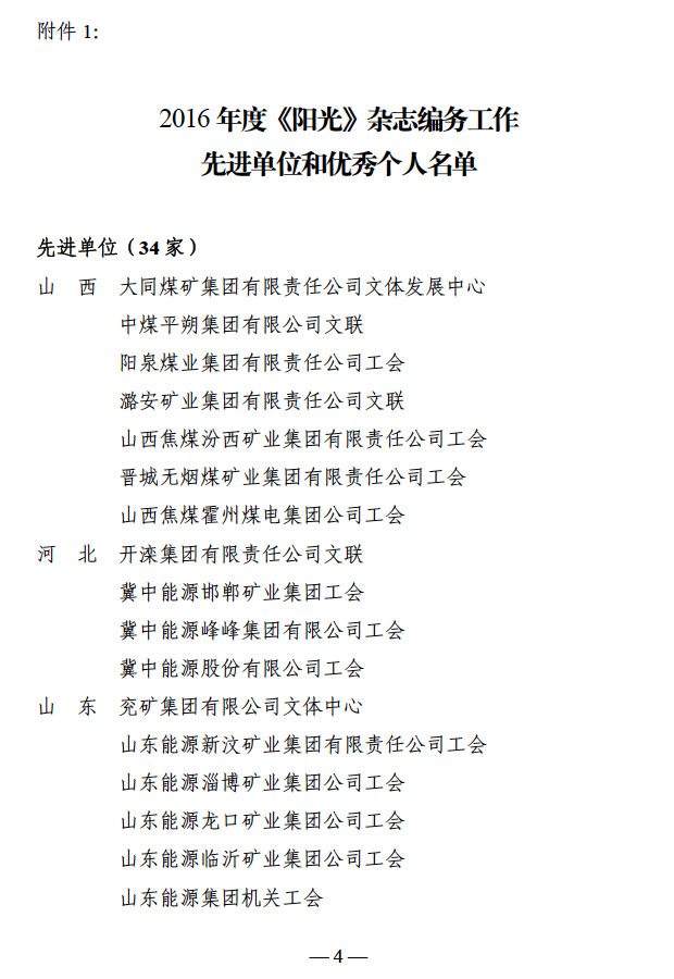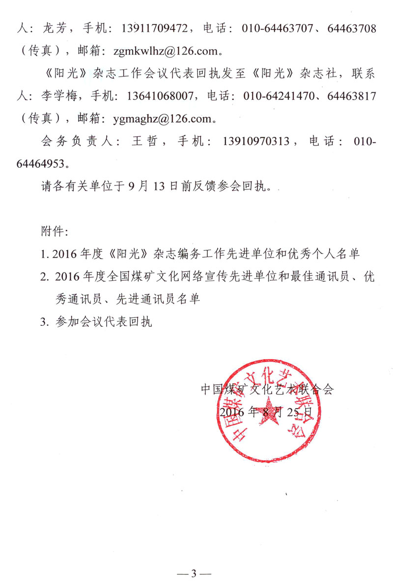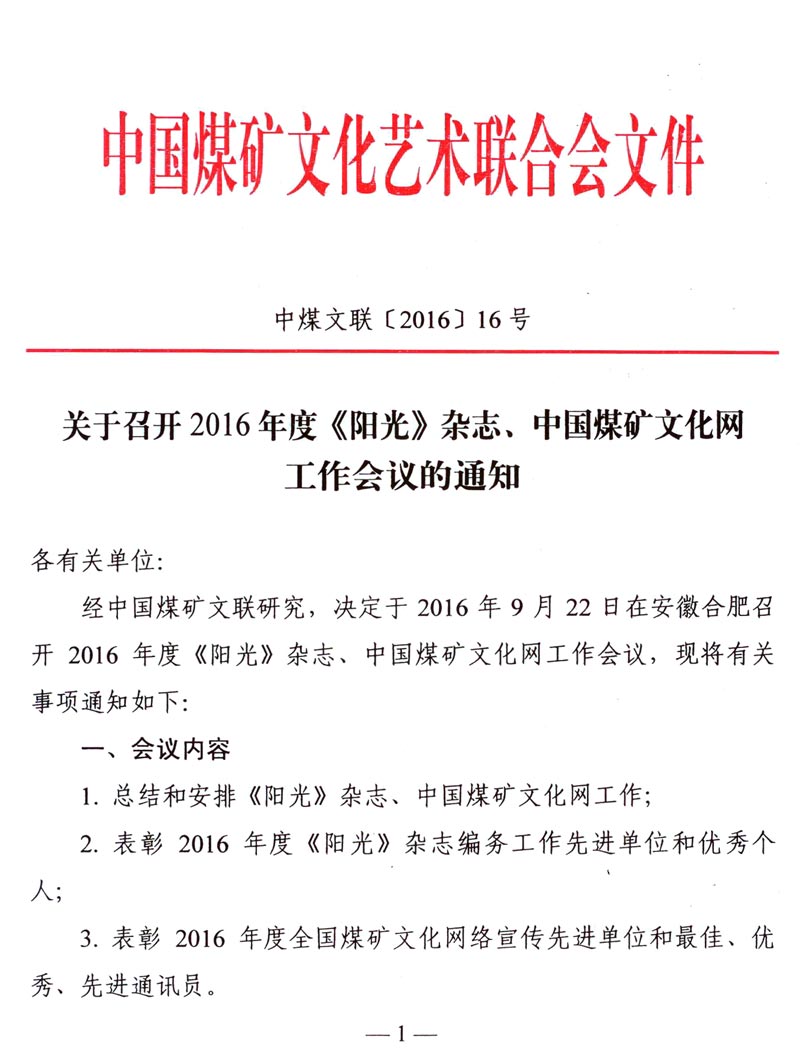 关于召开2016年度《阳光》杂志、中国煤矿文化网工作会议的通知 来源:中国煤矿文联 作者: 时间:2016-08-31 【字体:小 大】 附件: 1. 2016年度《阳光》杂志编务工作先进单位和优秀个人名单 2. 2016年度全国煤矿文化网络宣传先进单位和最佳通讯员、优秀通讯员、先进通讯员名单 3. 参加会议代表回执 智能标签: 《阳光》杂志 中国煤矿文化网 相关内容 分享到: 【打印正文】