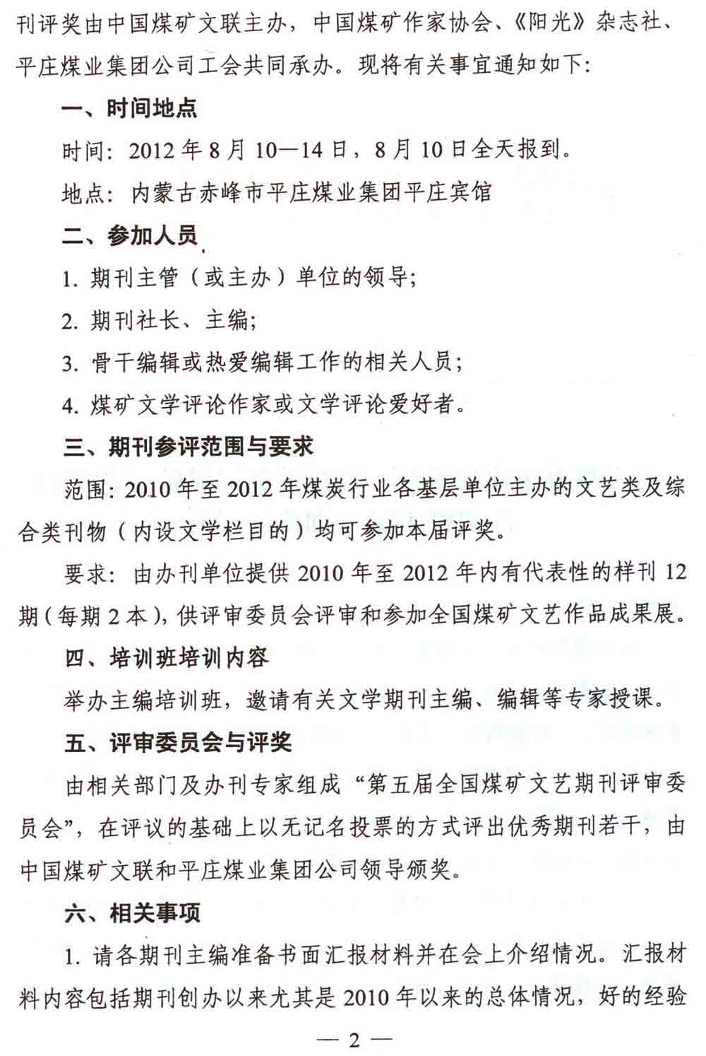 关于举办平庄煤业杯·第五届全国煤矿文艺期刊评奖暨主编培训班的通知