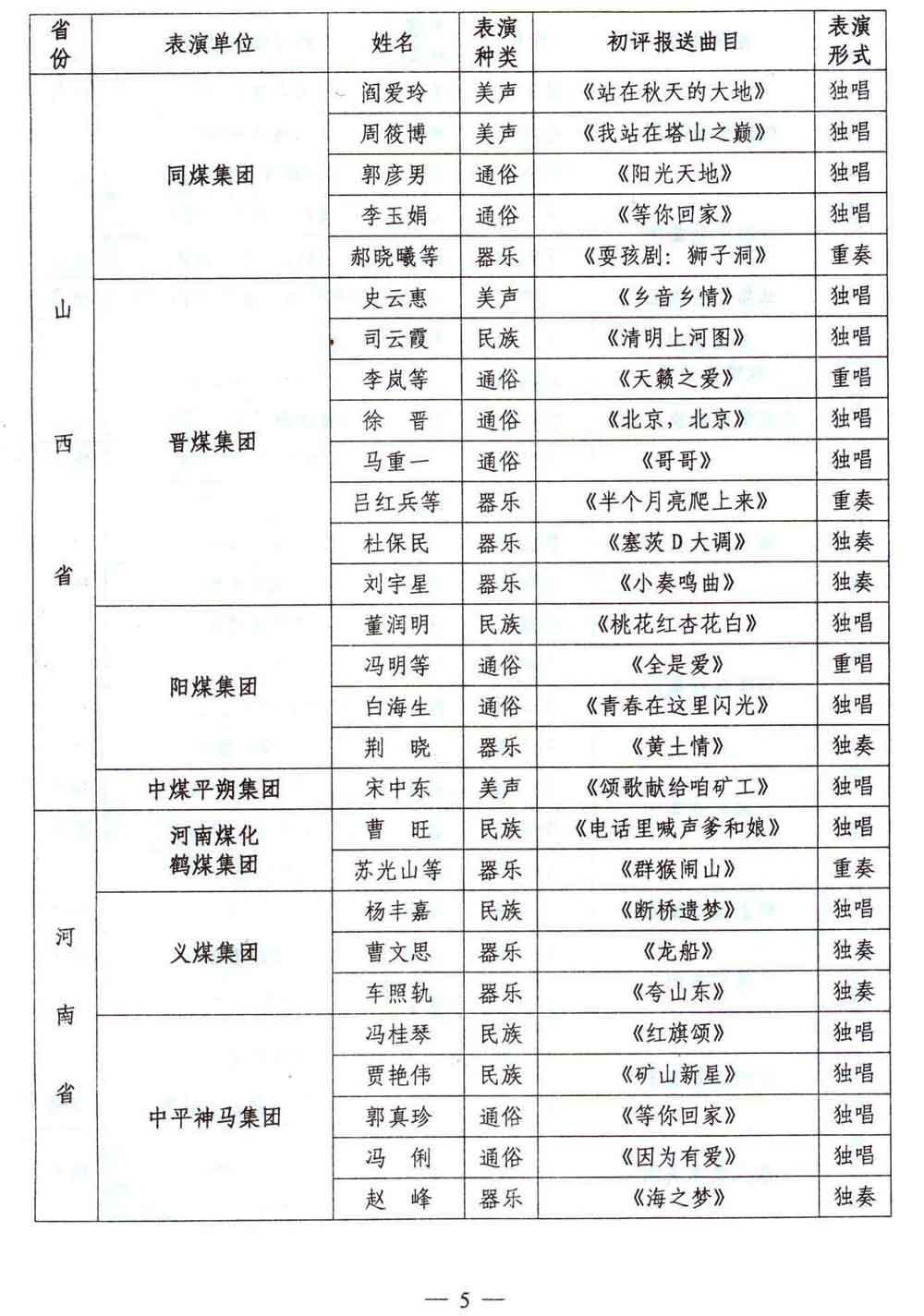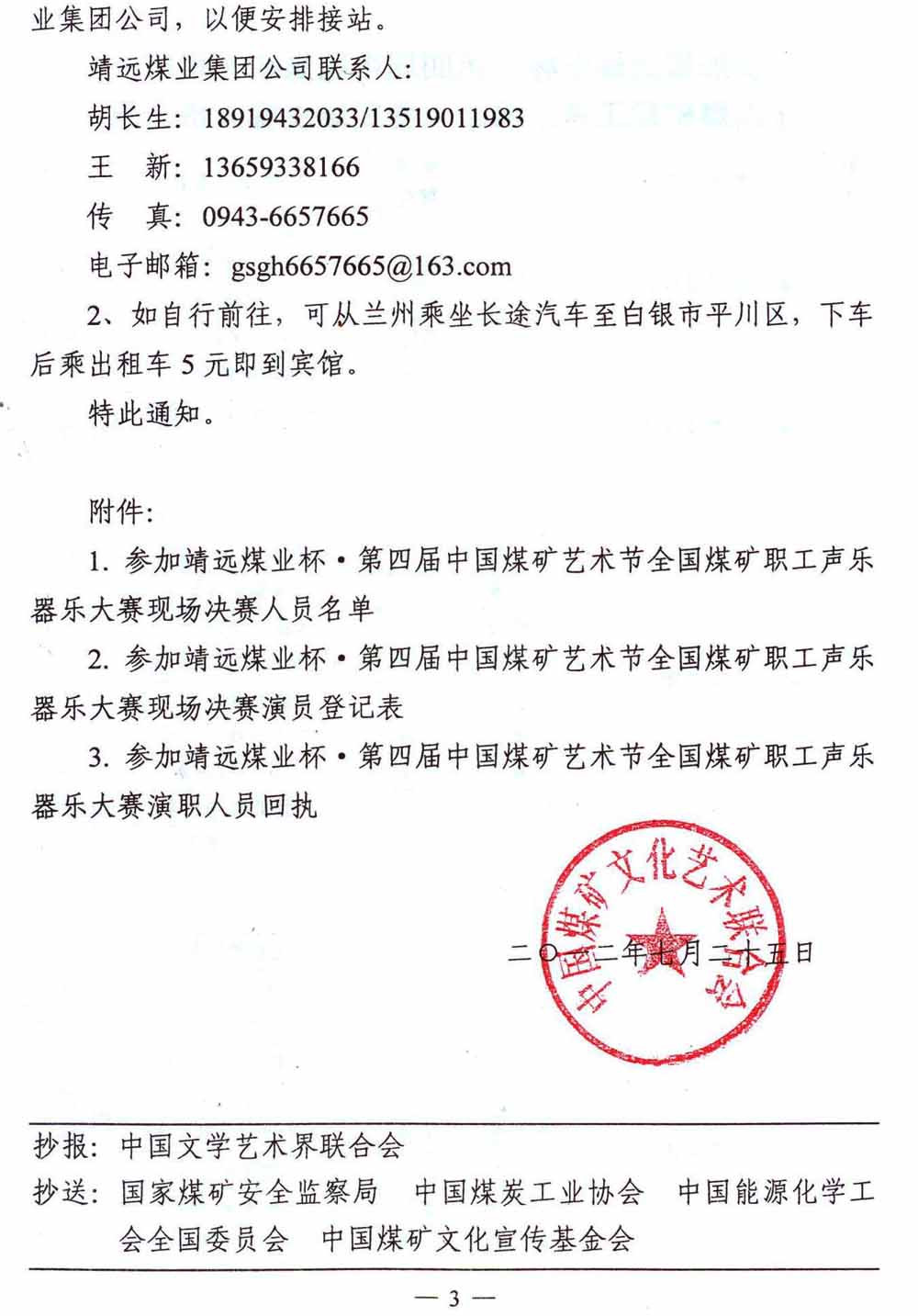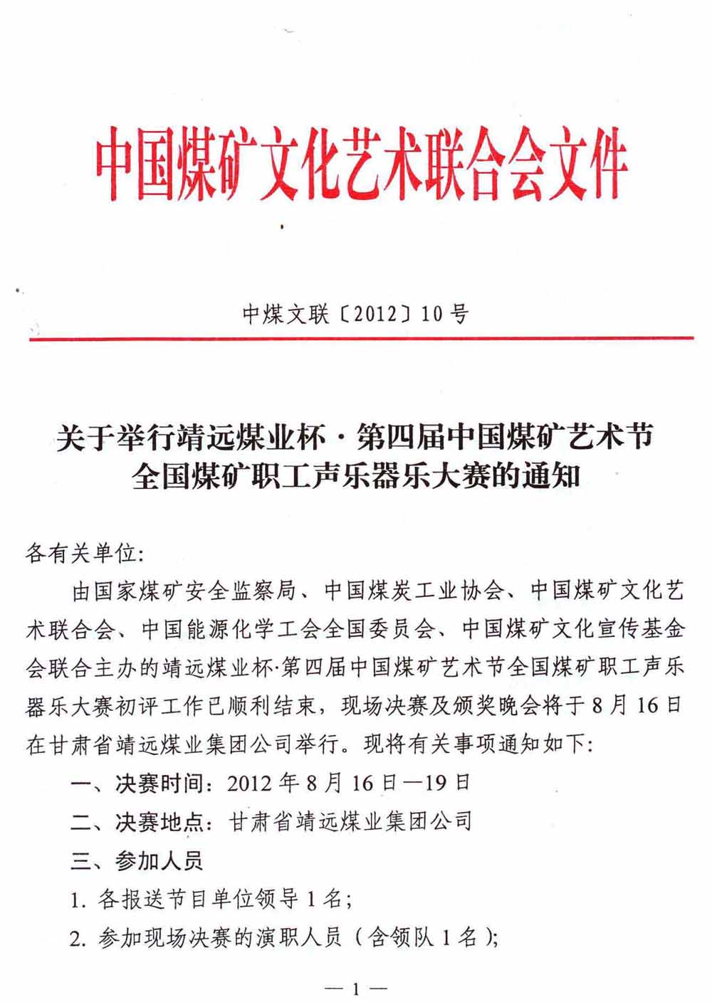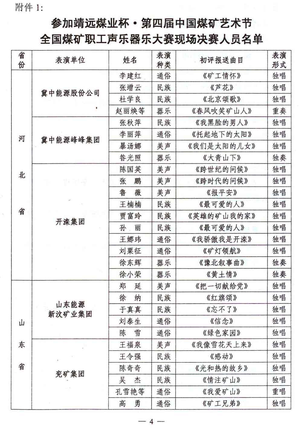关于举行靖远煤业杯·第四届中国煤矿艺术节全国煤矿职工声乐器乐大赛的通知 来源:中国煤矿文化网 作者:煤矿文联 时间:2012-07-27 【字体:小 大】 附件:参加靖远煤业杯第四届中国煤矿艺术节全国煤矿职工声乐器乐大赛现场决赛演员登记表及演职人员回执 分享到: 【打印正文】