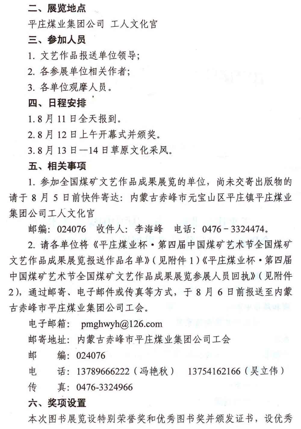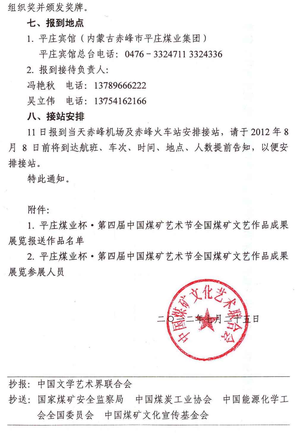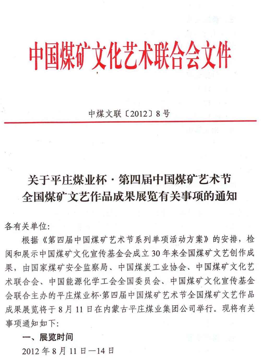关于平庄煤业杯·第四届中国煤矿艺术节全国煤矿文艺作品成果展览有关事项的通知 来源:中国煤矿文化网 作者:煤矿文联 时间:2012-07-27 【字体:小 大】 附件:平庄煤业杯·第四届中国煤矿艺术节全国煤矿文艺作品成果展览报送作品名单及参展人员回执 分享到: 【打印正文】