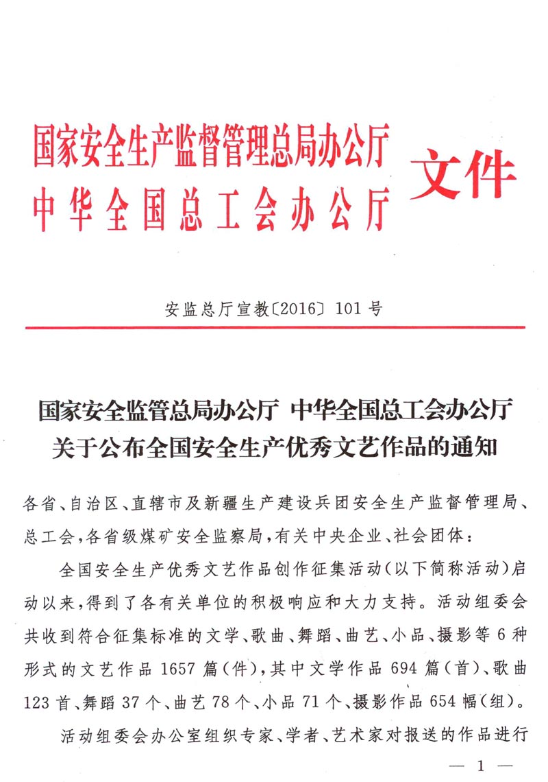 国家安监总局 全国总工会 关于公布全国安全生产优秀文艺作品的通知 来源:中国煤矿文联 作者: 时间:2016-09-13 【字体:小 大】 智能标签: 安全生产优秀文艺作品 相关内容 分享到: 【打印正文】