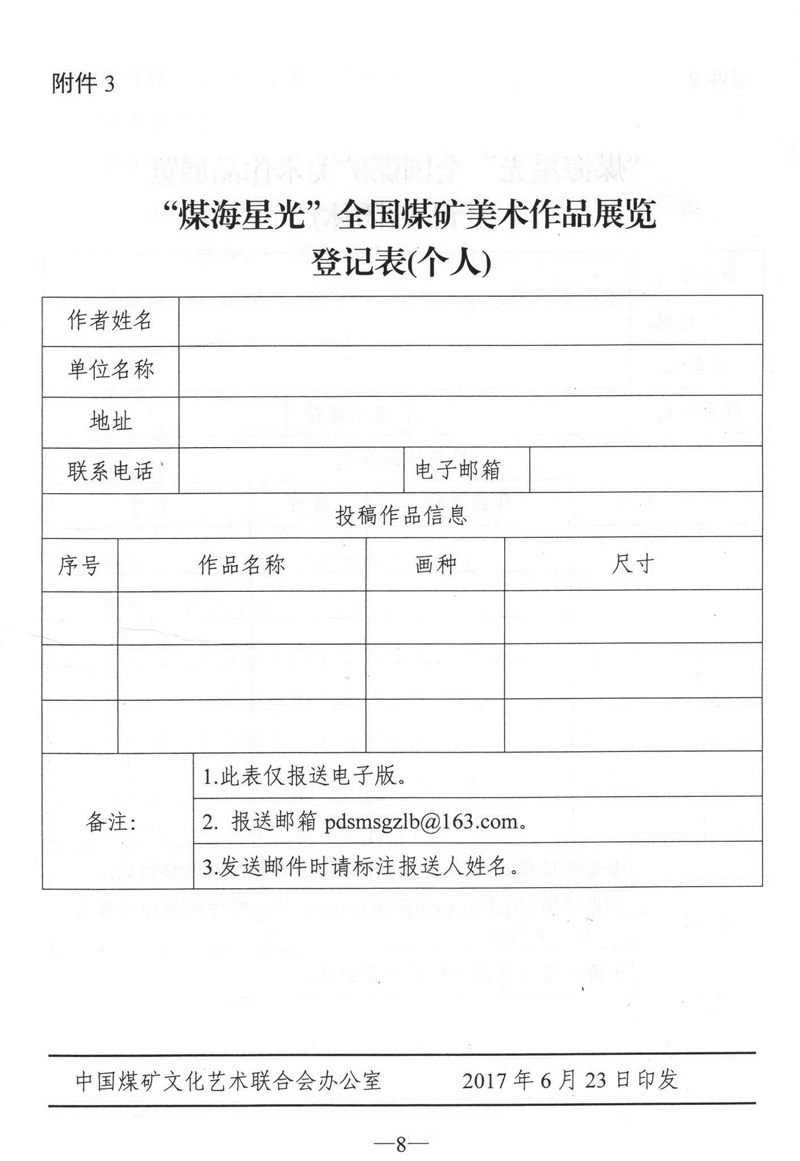 关于举办“煤海星光”全国煤矿美术作品展览的通知 来源:中国煤矿文联 作者: 时间:2017-06-28 【字体:小 大】 附件: 1.“煤海星光”全国煤矿美术作品展览组委会 2.“煤海星光”全国煤矿美术作品展览登记表(团体) 3.“煤海星光”全国煤矿美术作品展览登记表(个人) 智能标签: 中国煤矿文联 相关内容 分享到: 【打印正文】