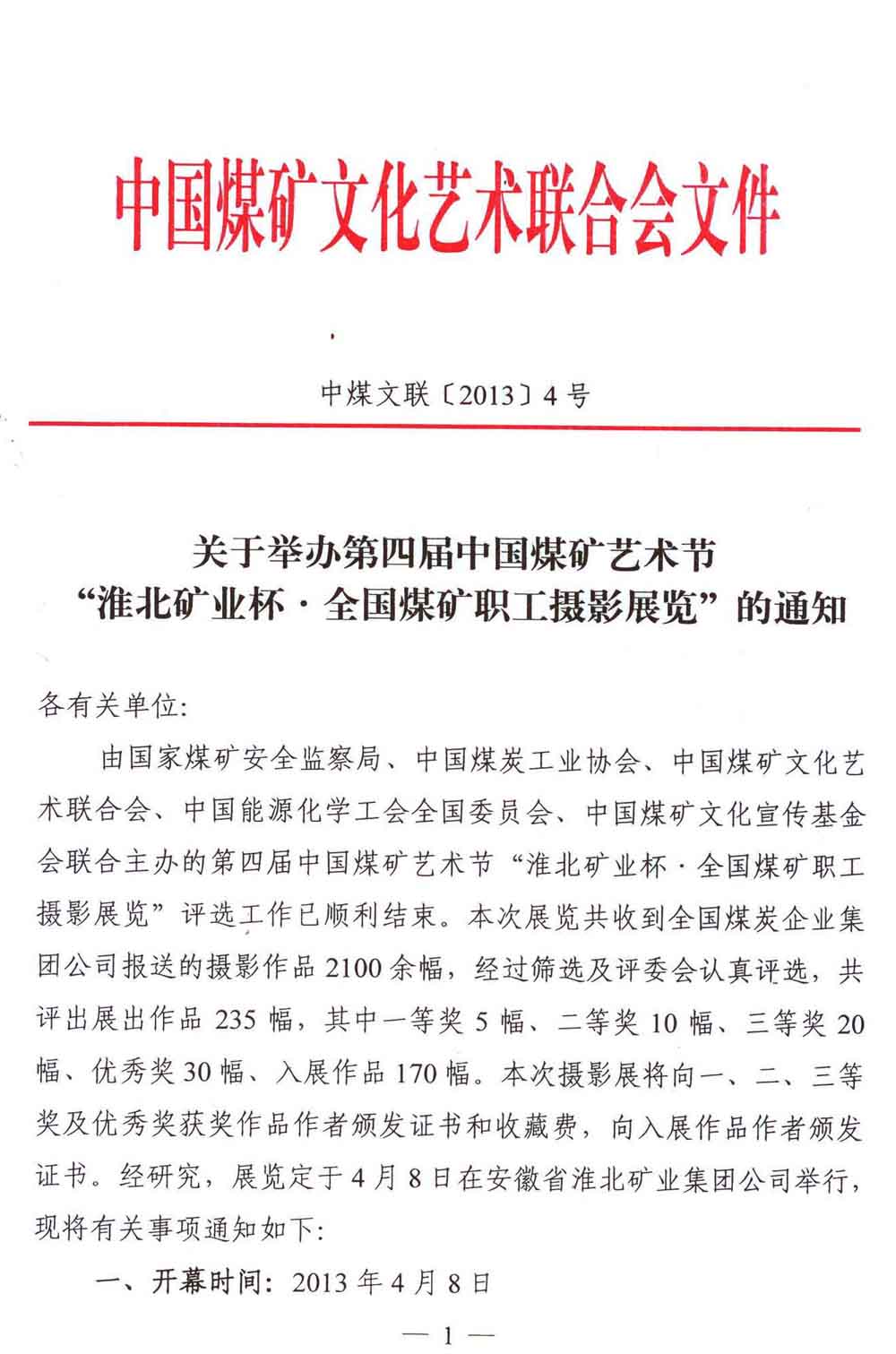 关于举办第四届中国煤矿艺术节“淮北矿业杯全国煤矿职工摄影展览”的通知 来源:中国煤矿文化网 作者:煤矿文联 时间:2013-03-22 【字体:小 大】 附件: 1.第四届中国煤矿艺术节淮北矿业杯全国煤矿职工摄影展览获奖、入展作品名单 2.第四届中国煤矿艺术节淮北矿业杯全国煤矿职工摄影展览评委会名单 3.中国煤矿文联摄影家协会理事名单 分享到: 【打印正文】