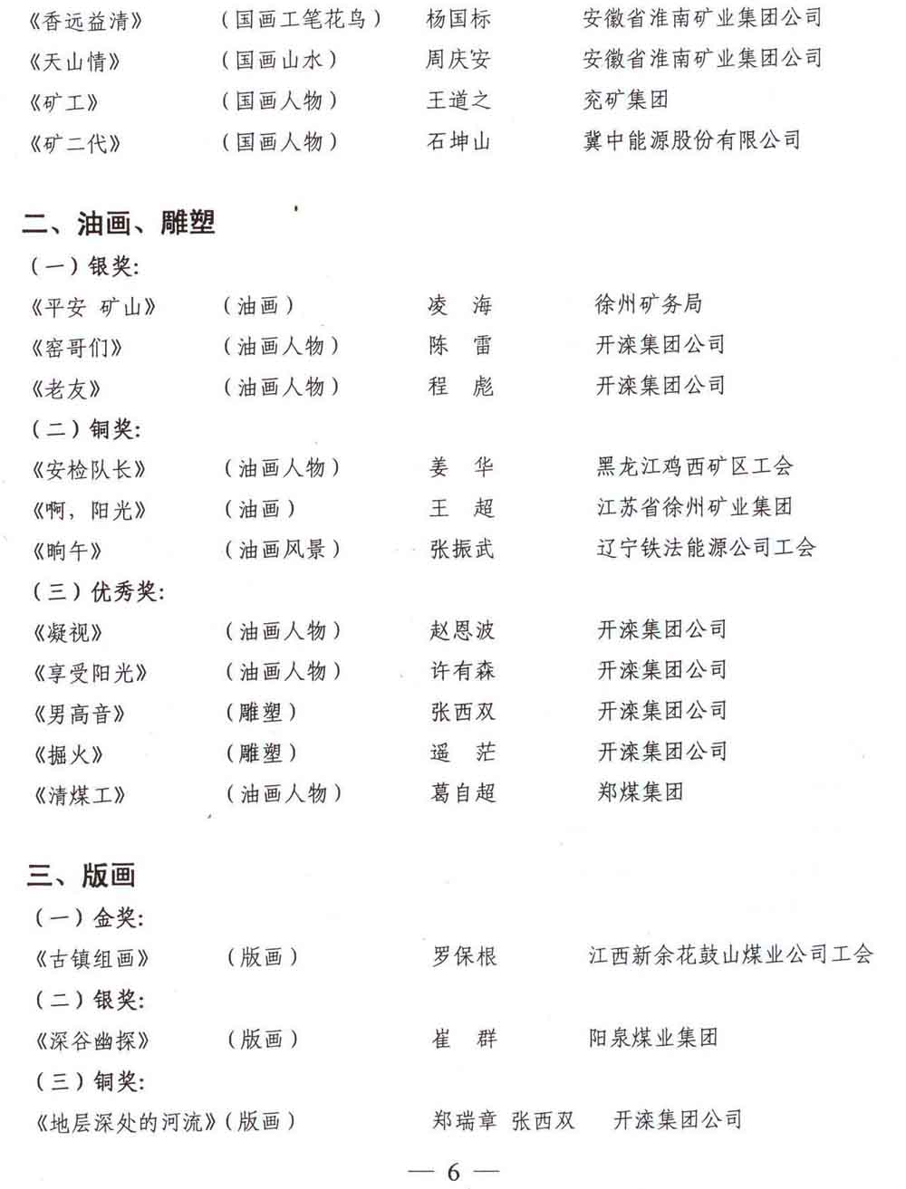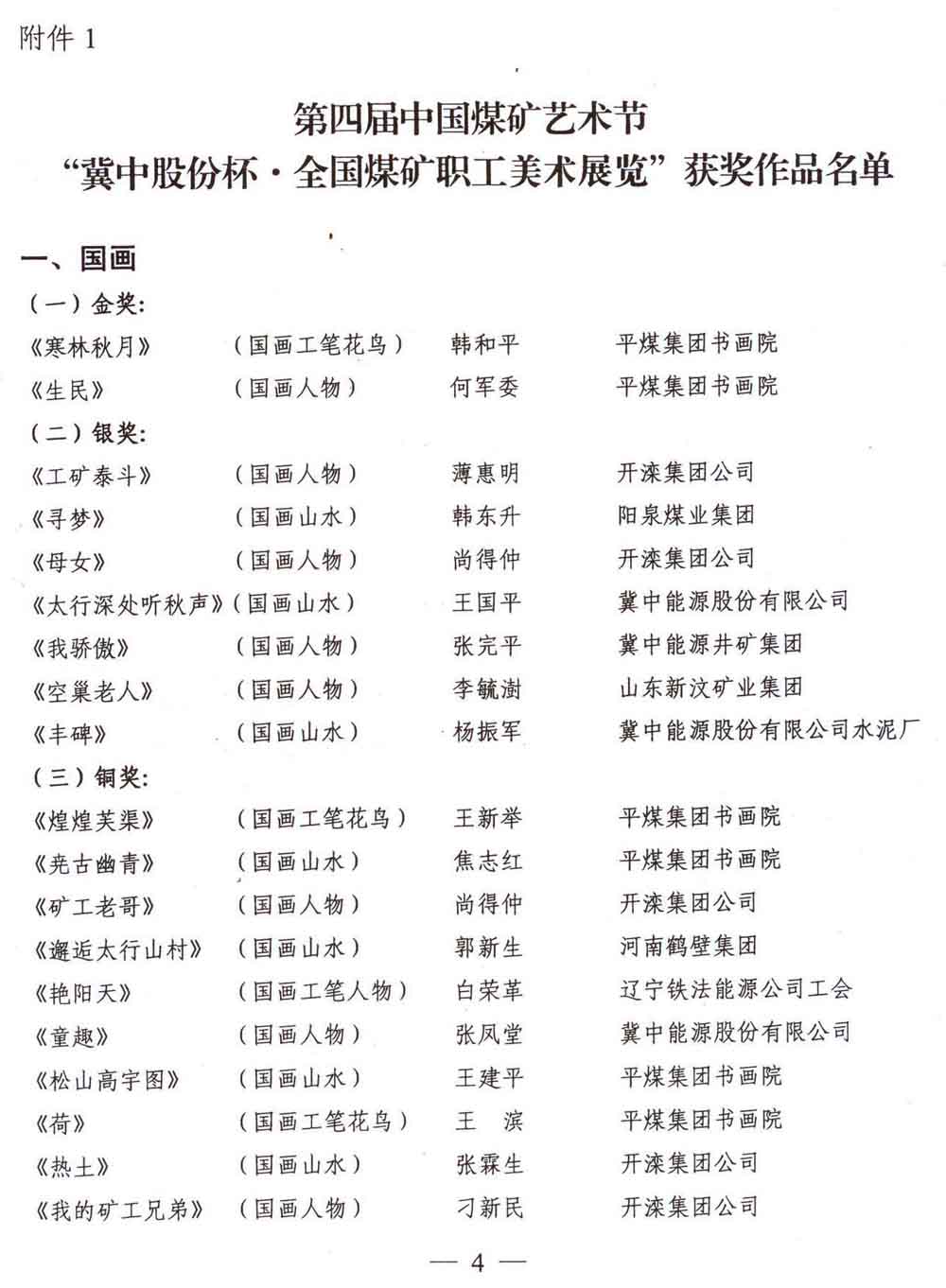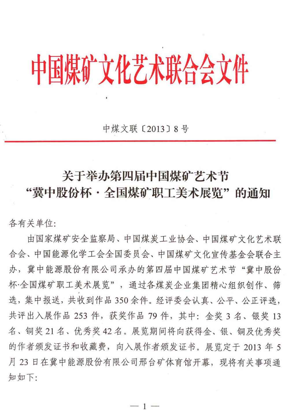 关于举办第四届煤矿艺术节“冀中股份杯全国煤矿职工美术展览”的通知 来源:中国煤矿文化网 作者:煤矿文联 时间:2013-05-02 【字体:小 大】 附件: 1.第四届中国煤矿艺术节冀中股份杯·全国煤矿职工美术展览获奖作品名单 2.第四届中国煤矿艺术节冀中股份杯·全国煤矿职工美术展览入选作品名单 3.第四届中国煤矿艺术节冀中股份杯·全国煤矿职工美术展览参展回执 分享到: 【打印正文】