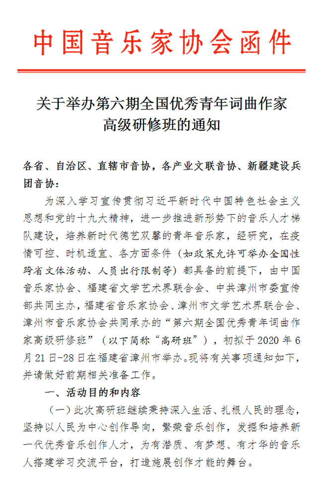 中国音协:关于举办第六期全国优秀青年词曲作家高级研修班的通知
