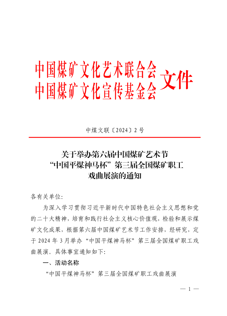 关于举办第六届中国煤矿艺术节“中国平煤神马杯”第三届全国煤矿职工戏曲展演的通知 来源:中国煤矿文联 作者: 时间:2024-01-10 【字体:小 大】 附件:第三届全国煤矿职工戏曲展演作品登记表 分享到: 【打印正文】