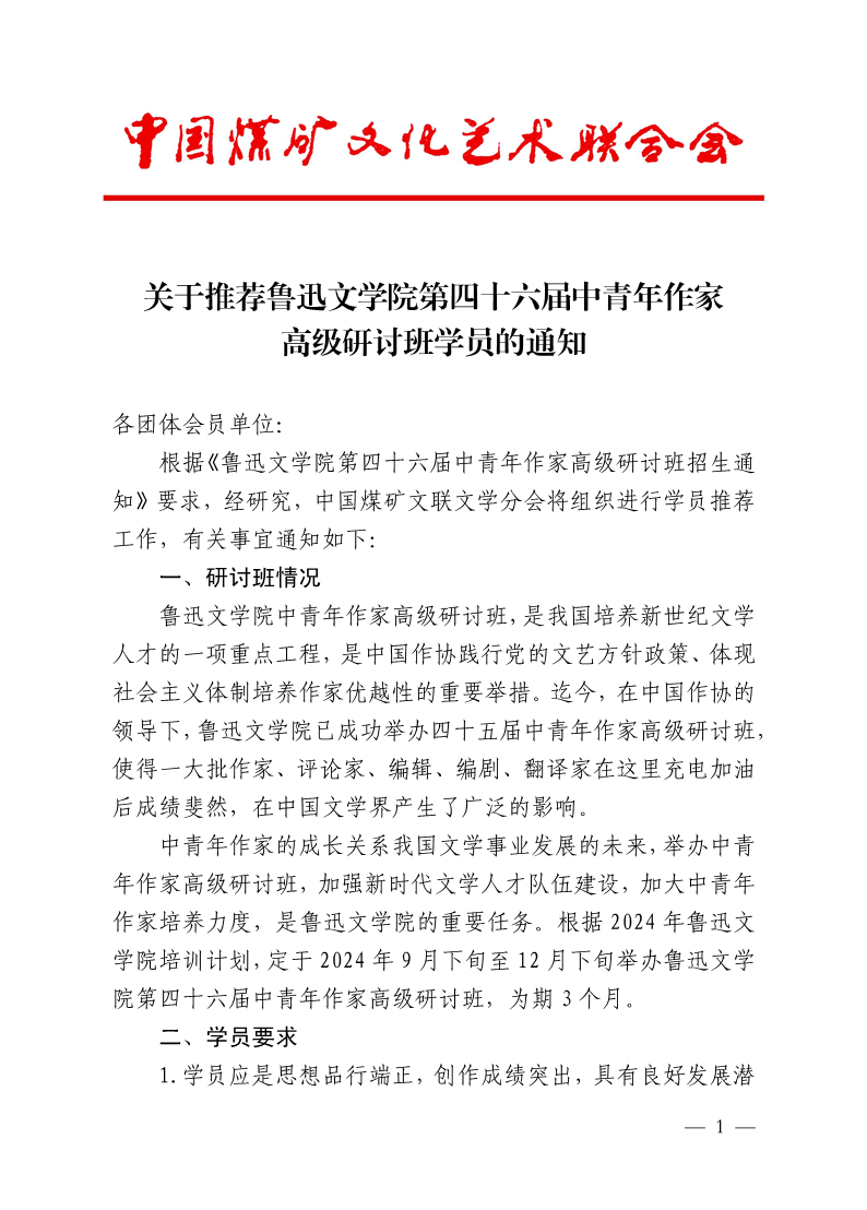 关于推荐鲁迅文学院第四十六届中青年作家高级研讨班学员的通知