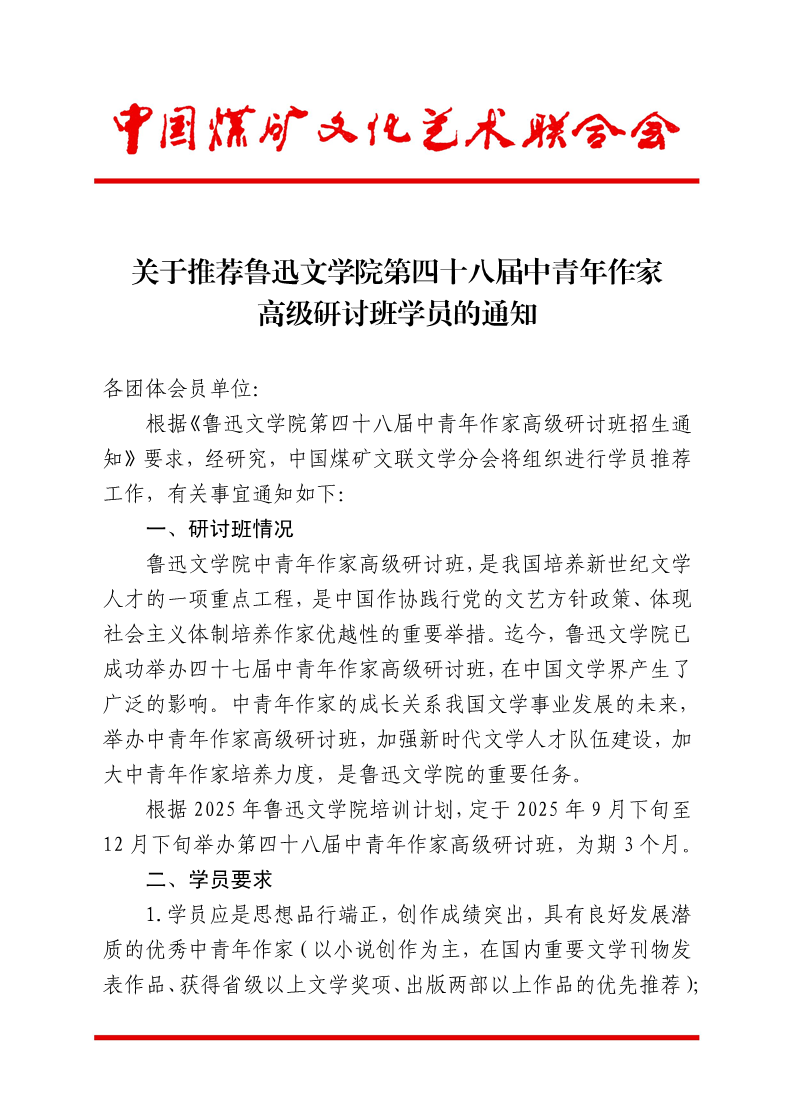 关于推荐鲁迅文学院第四十八届中青年作家高级研讨班学员的通知 来源:中国煤矿文联 作者: 时间:2025-07-09 【字体:小 大】 附件下载(含学员报名表、学员基本情况表、学员通讯资料表、学员纸质材料目录) 分享到: 【打印正文】