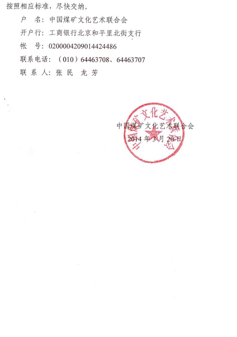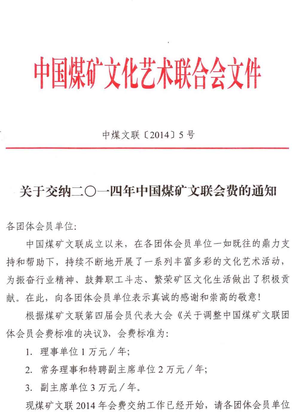 关于交纳二○一四年中国煤矿文联会费的通知