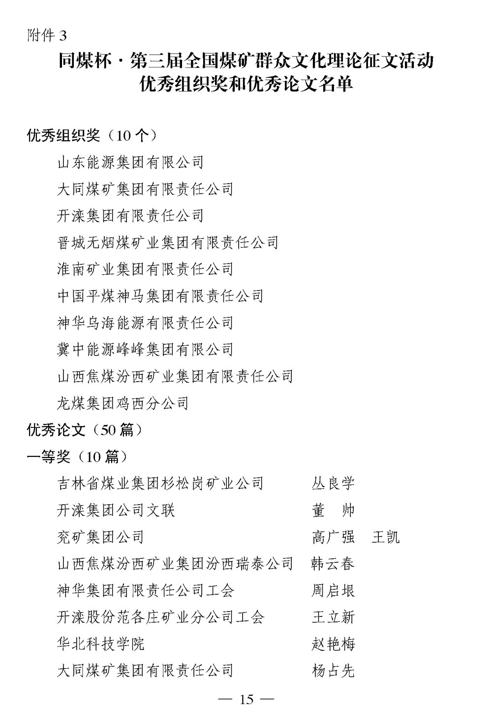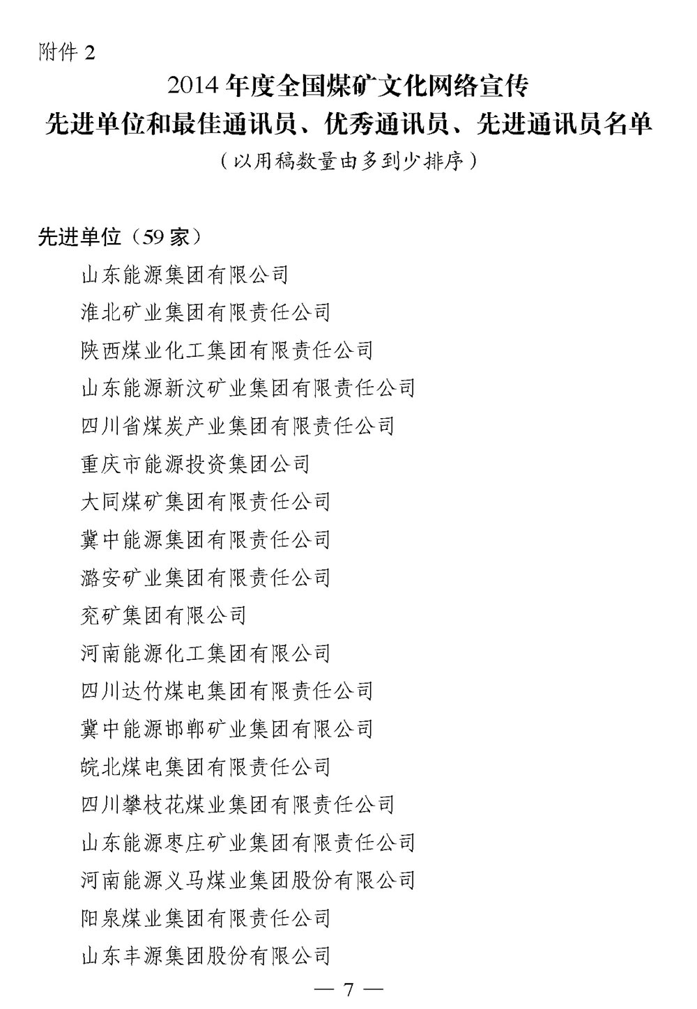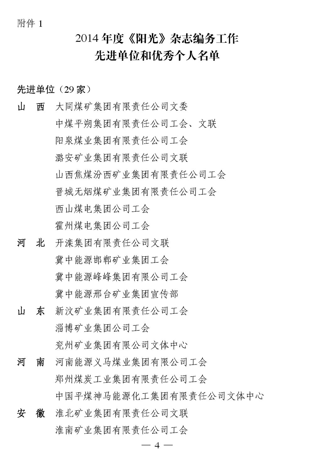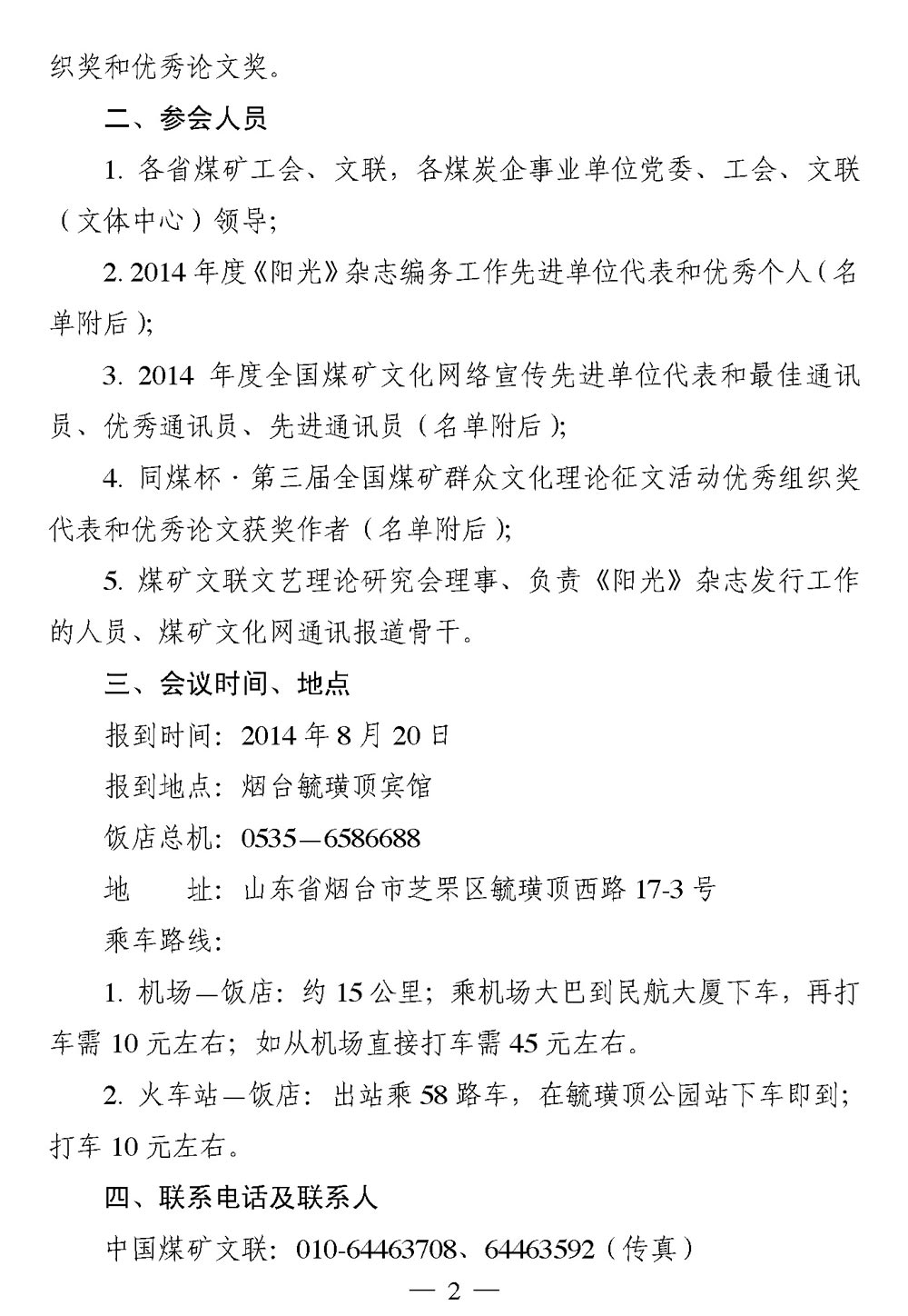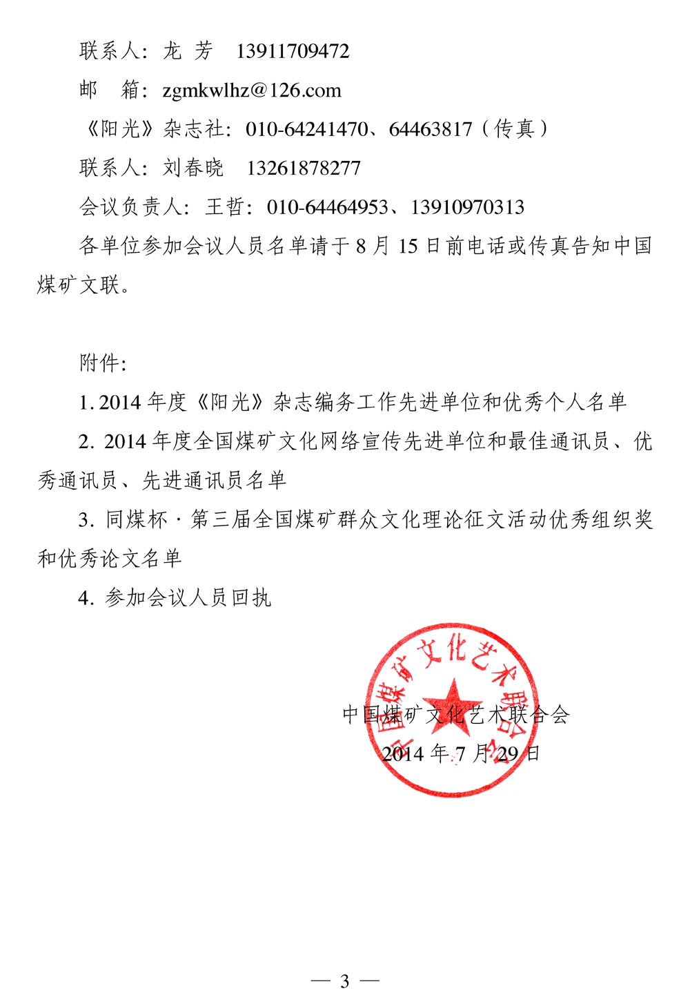 关于召开2014年度《阳光》杂志、煤矿文化网工作会暨煤矿文艺理论研究会年会的通知 来源:中国煤矿文联 作者: 时间:2014-07-31 【字体:小 大】 附件: 1. 2014年度《阳光》杂志编务工作先进单位和优秀个人名单 2. 2014年度全国煤矿文化网络宣传先进单位和最佳通讯员、优秀通讯员、先进通讯员名单 3. 同煤杯·第三届全国煤矿群众文化理论征文活动优秀组织奖和优秀论文名单 4. 参加会议人员回执 分享到: 【打印正文】