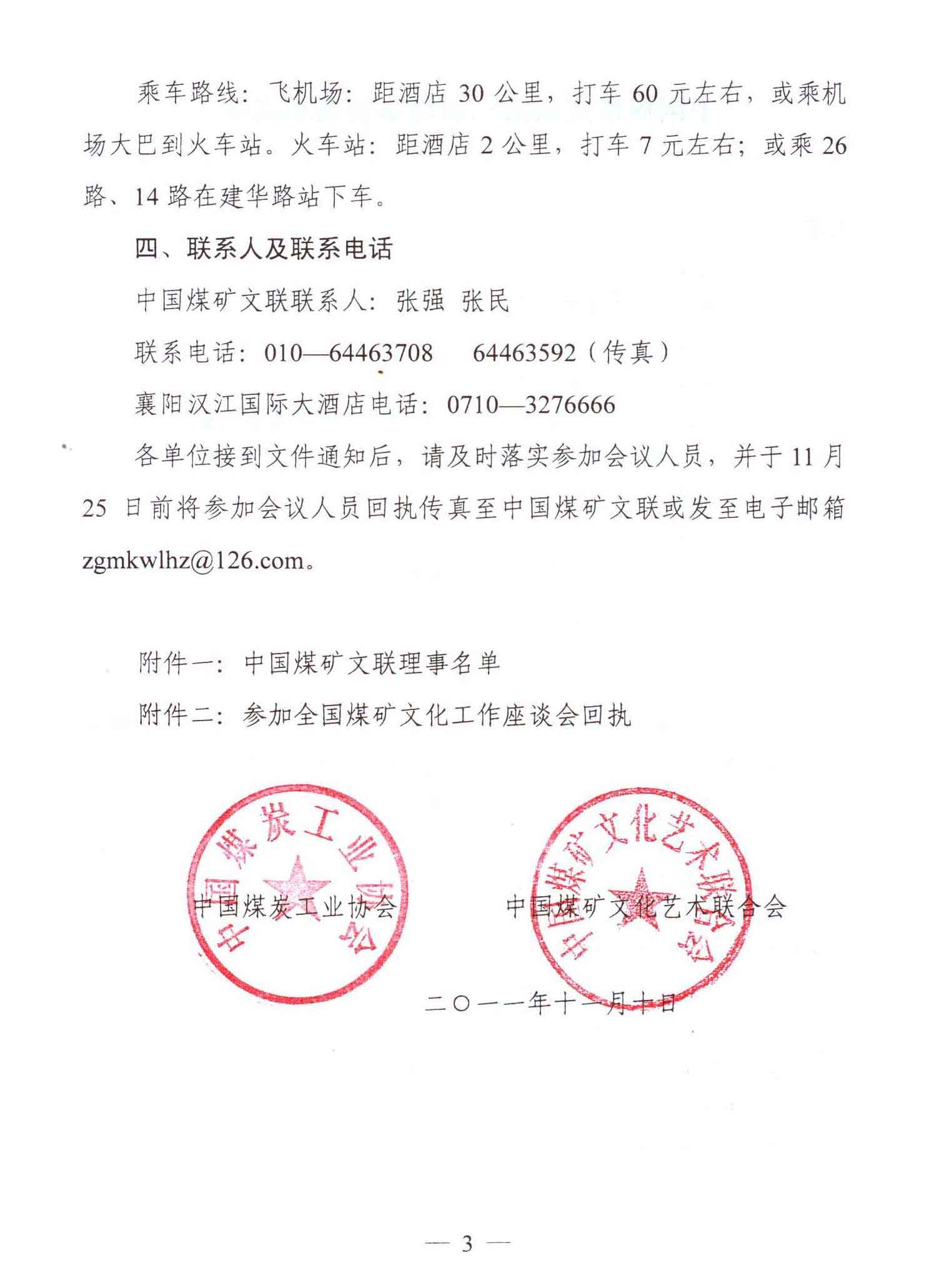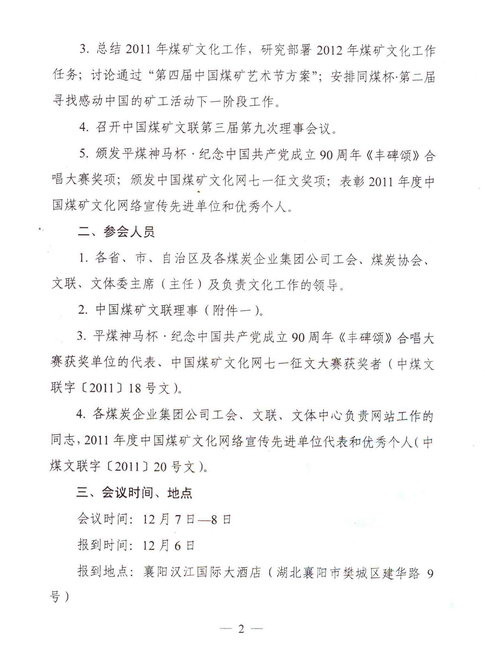 关于召开全国煤矿文化工作座谈会的通知 来源:中国煤矿文化网 作者:煤矿文联 时间:2011-11-15 【字体:小 大】 附件1:中国煤矿文联第三届理事会理事名单 附件2:参加全国煤矿文化工作座谈会回执 分享到: 【打印正文】
