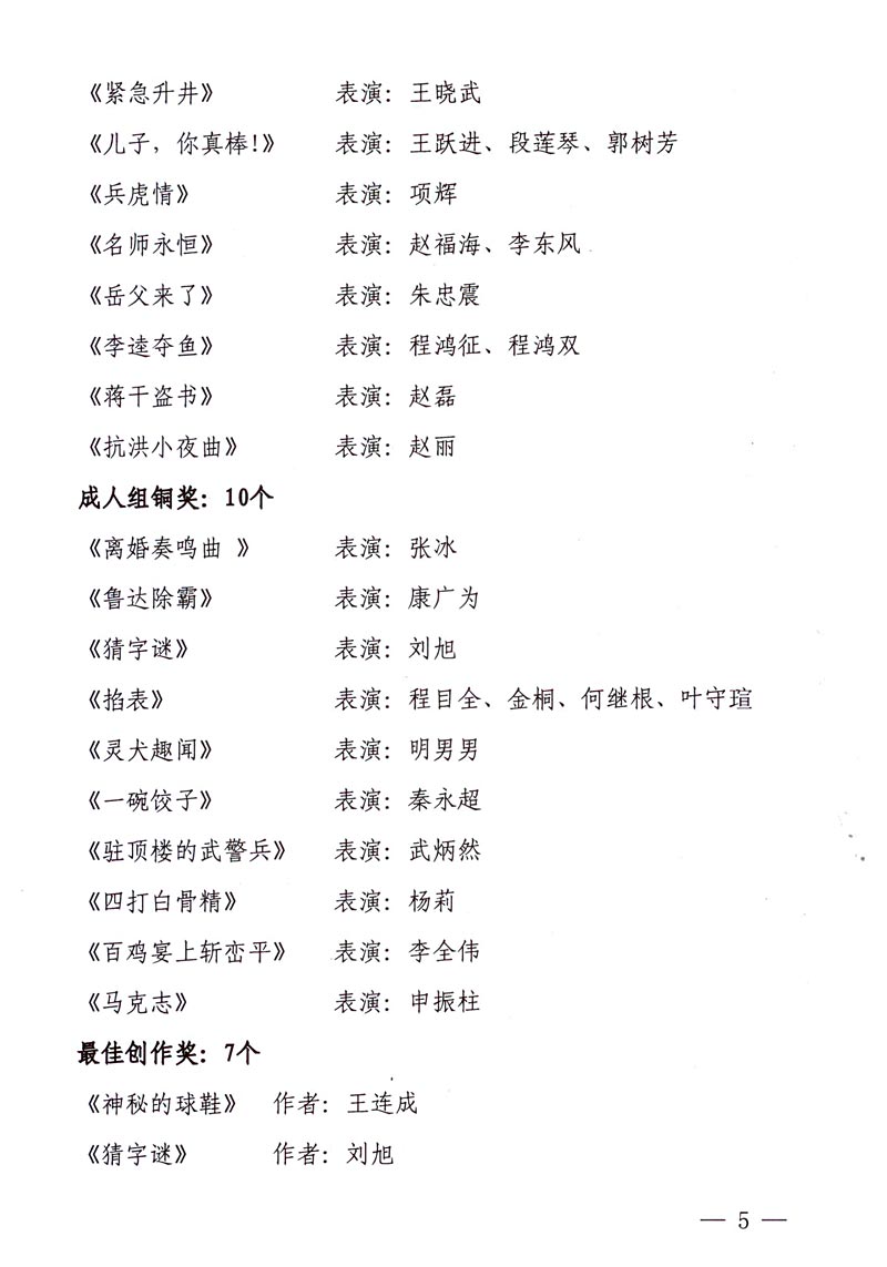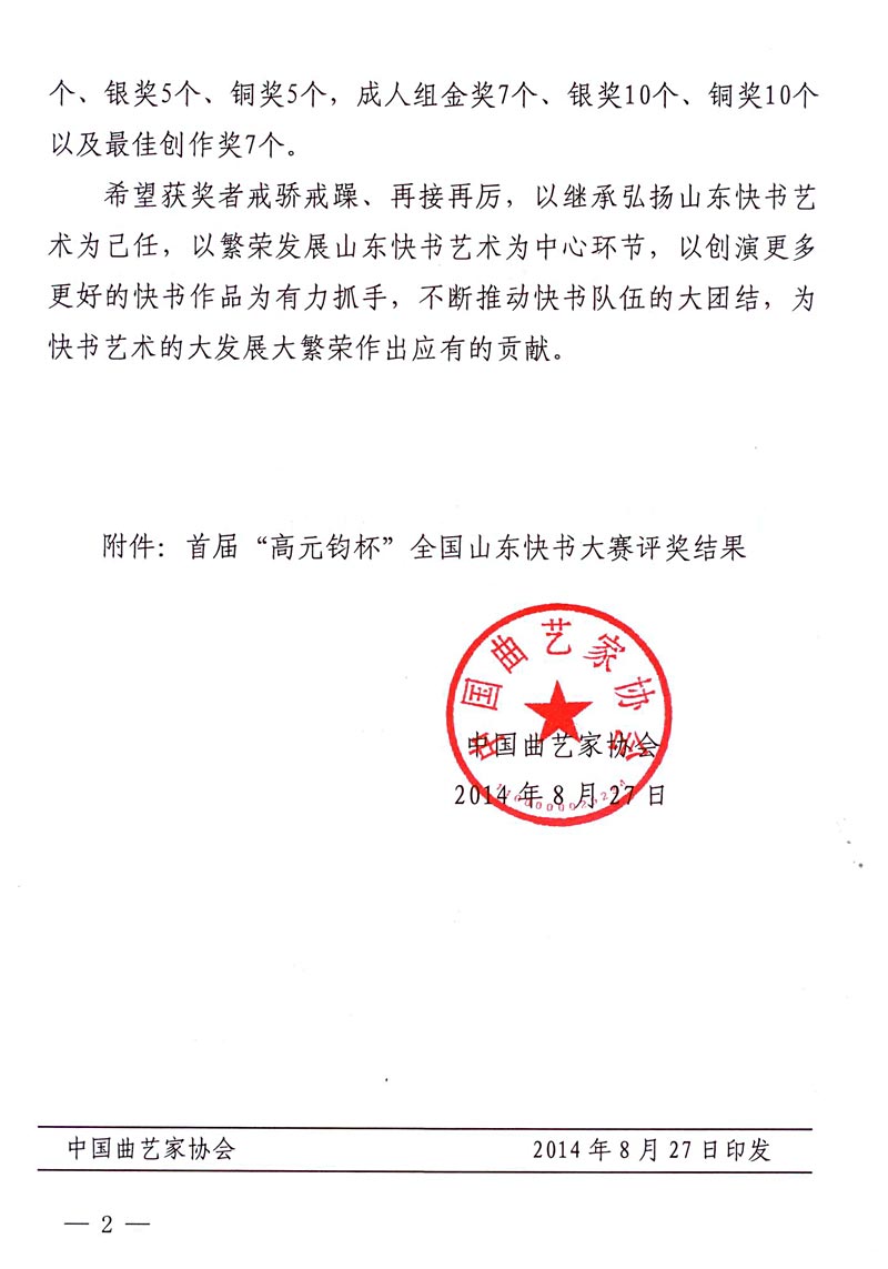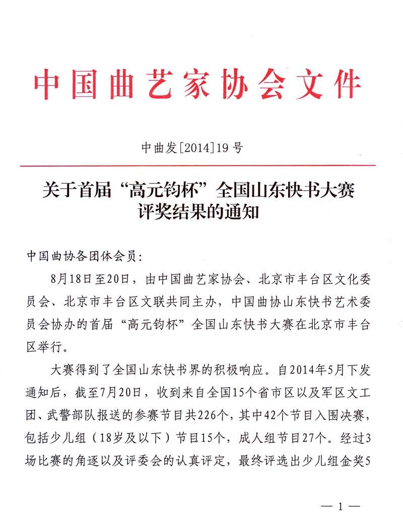 中国曲协:关于首届“高元均杯”全国山东快书大赛评奖结果的通知