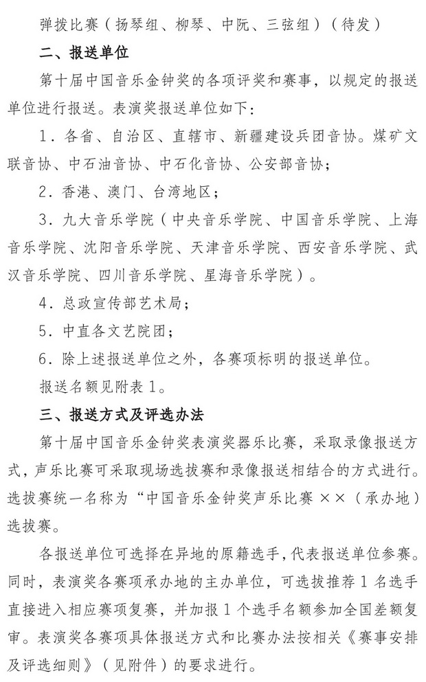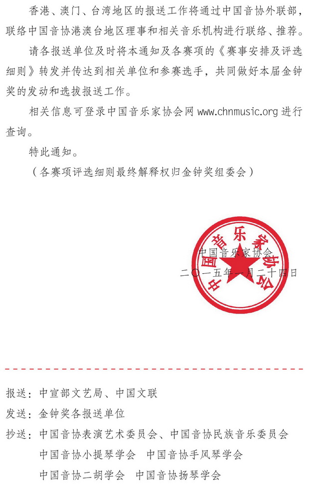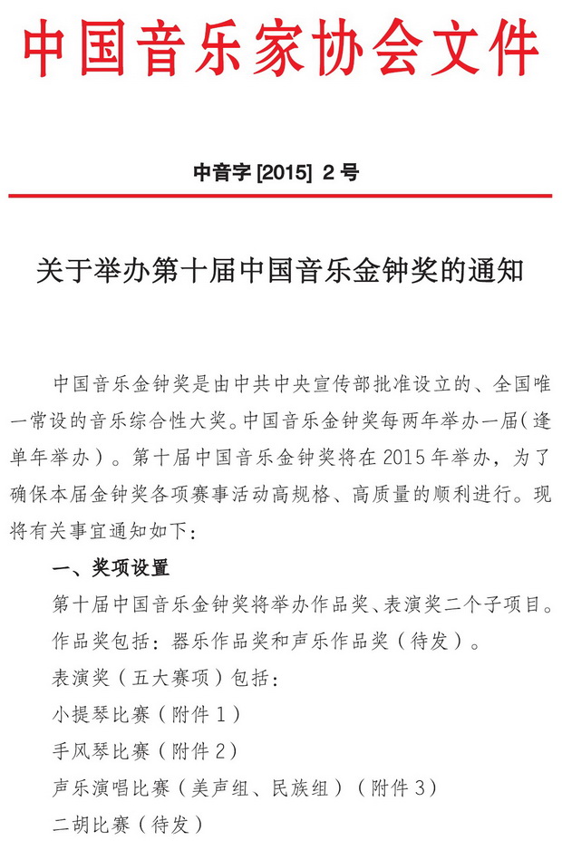 中国音协:关于举办第十届中国音乐金钟奖的通知 来源:中国音乐家协会 作者: 时间:2015-01-29 【字体:小 大】 附件下载: 第十届中国音乐金钟奖小提琴比赛评选细则(定版).pdf 第十届中国音乐金钟奖手风琴比赛评选细则.pdf 第十届中国音乐金钟奖声乐比赛评选细则.pdf 智能标签: 中国音协 中国音乐 金钟奖 相关内容 分享到: 【打印正文】
