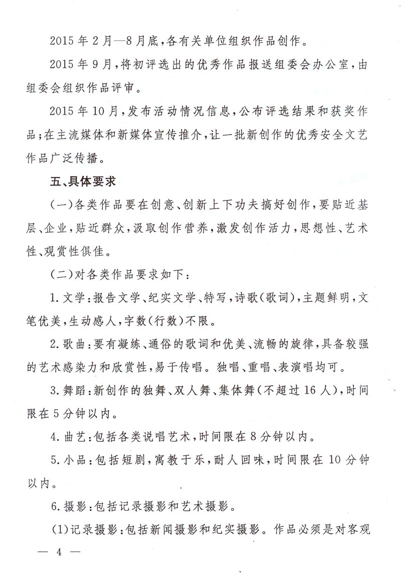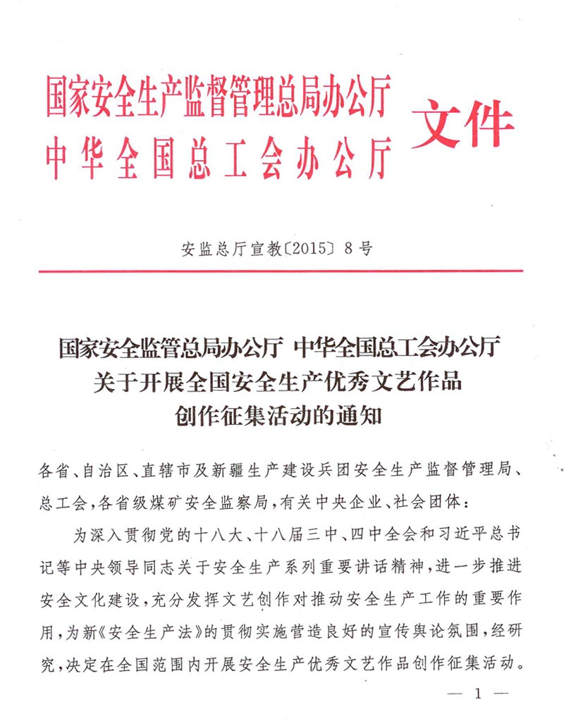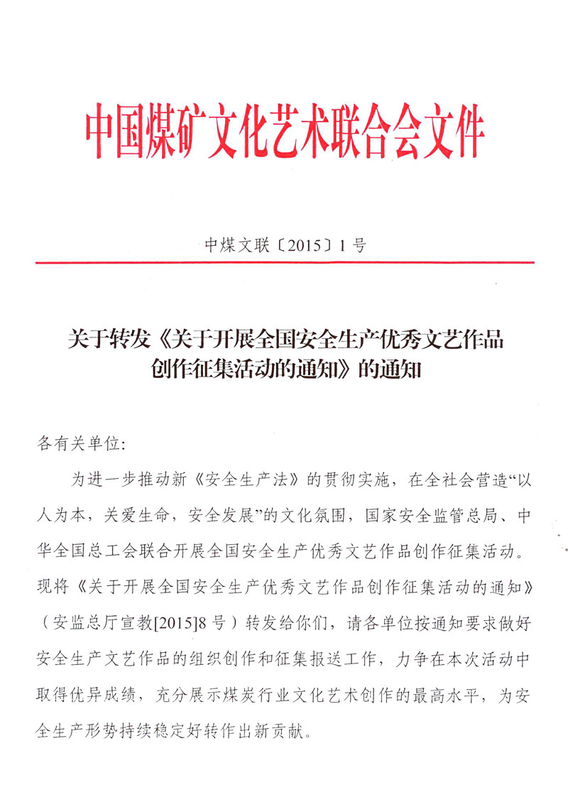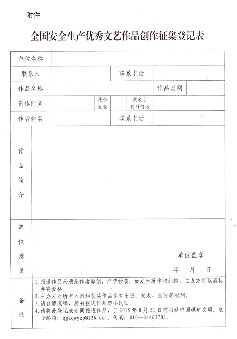 关于转发《关于开展全国安全生产优秀文艺作品创作征集活动的通知》的通知 来源: 作者: 时间:2015-02-04 【字体:小 大】 附件:《关于开展全国安全生产优秀文艺作品创作征集活动的通知》 登记表下载:全国安全生产优秀文艺作品创作征集登记表 智能标签: 安全生产 文艺作品 创作 征集 相关内容 分享到: 【打印正文】