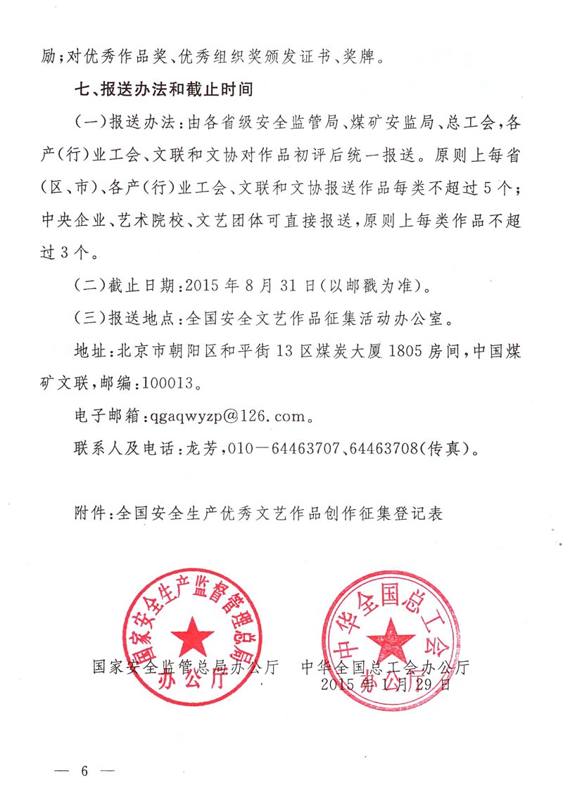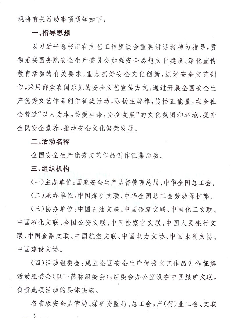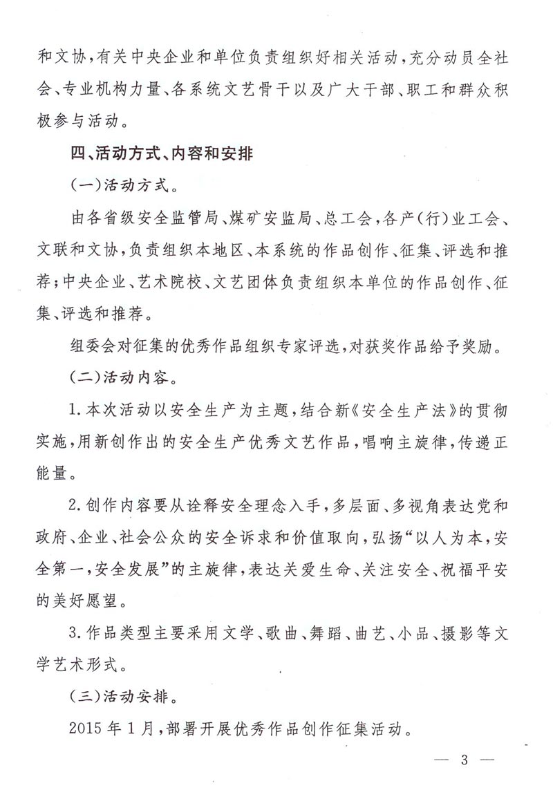 关于转发《关于开展全国安全生产优秀文艺作品创作征集活动的通知》的通知 来源: 作者: 时间:2015-02-04 【字体:小 大】 附件:《关于开展全国安全生产优秀文艺作品创作征集活动的通知》 登记表下载:全国安全生产优秀文艺作品创作征集登记表 智能标签: 安全生产 文艺作品 创作 征集 相关内容 分享到: 【打印正文】