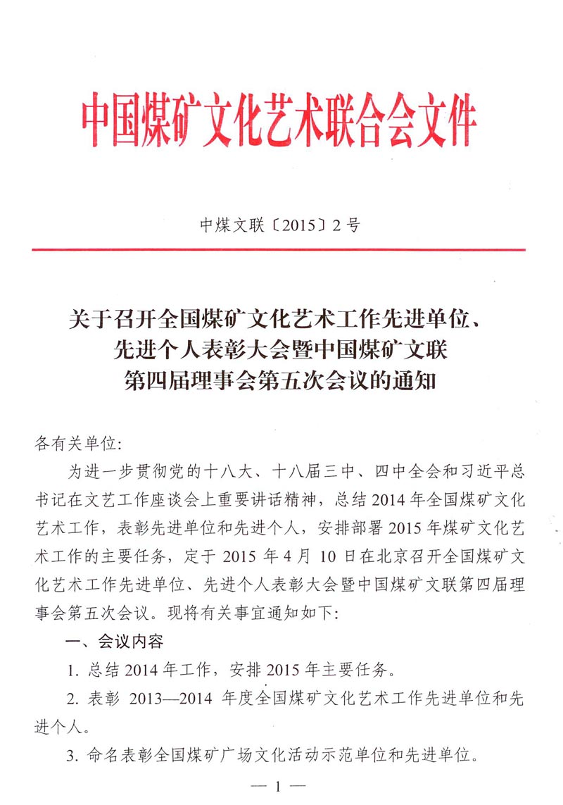 关于召开全国煤矿文化艺术工作先进单位、 先进个人表彰大会暨中国煤矿文联第四届理事会第五次会议的通知 来源: 作者: 时间:2015-03-19 【字体:小 大】 附件一:中国煤矿文联第四届理事会理事名单 附件二:拟调整和增补中国煤矿文联第四届理事会部分理事名单 附件三:2013—2014年度全国煤矿文化艺术工作先进单位和先进个人名单 附件四:全国煤矿广场文化活动示范单位、先进单位名单 附件五:中煤保险杯·中国梦 矿山情新媒体展选活动微电影、视频、摄影图片优秀组织单位和获奖作者名单 附件六:全国煤矿职工乌金艺术奖十佳美术作品、十佳书法作品奖、十佳摄影作品获奖作者名单 附件七:参加会议人员回执表 智能标签: 煤矿文化艺术 先进单位 先进个人 中国煤矿文联 理事会 相关内容 分享到: 【打印正文】