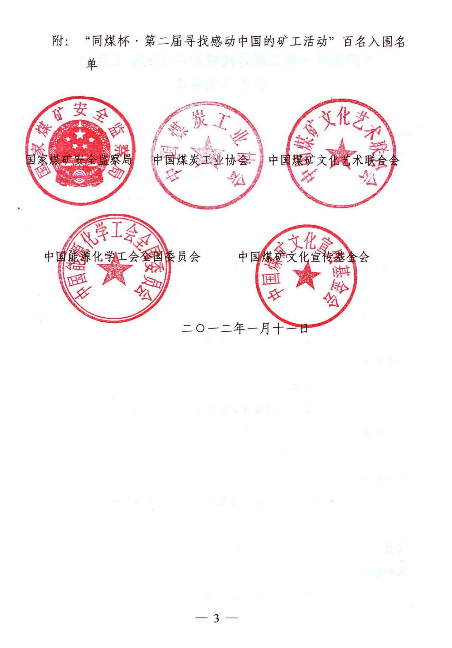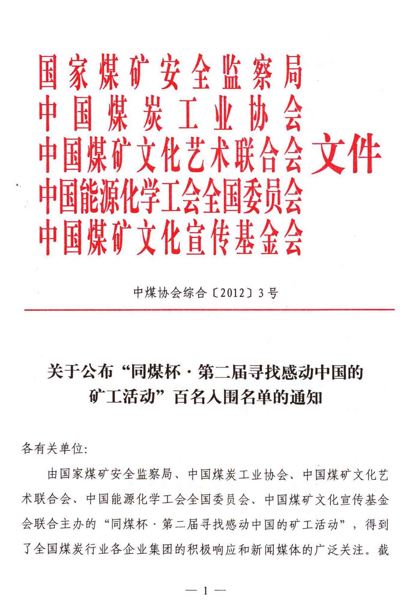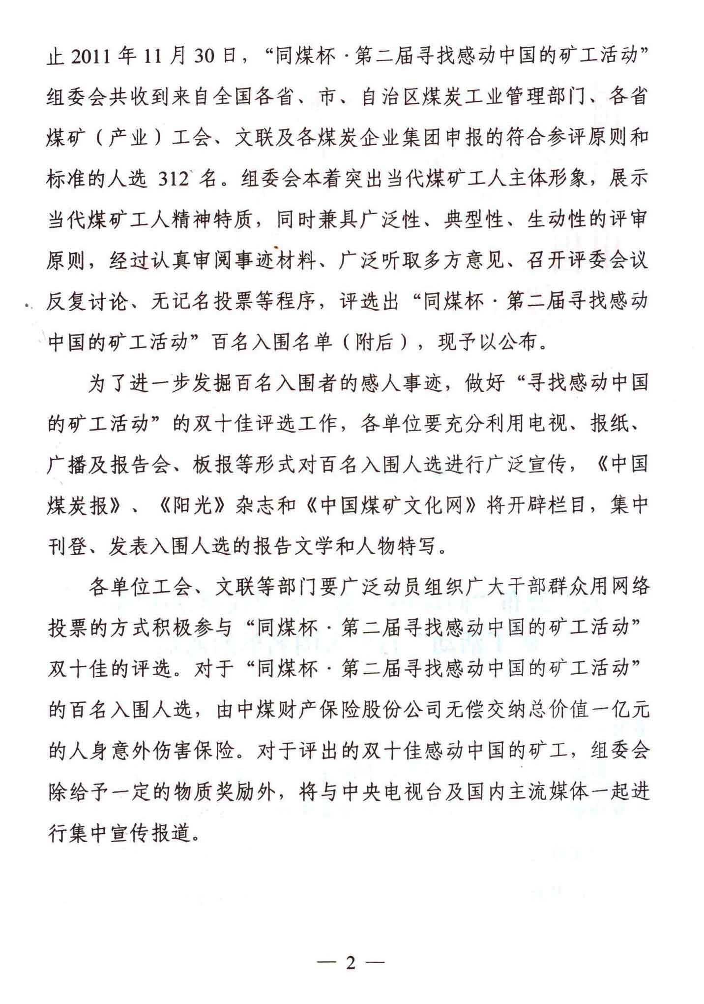 关于公布“同煤杯•第二届寻找感动中国的矿工活动”百名入围名单的通知 来源: 作者: 时间:2012-01-11 【字体:小 大】 附:“同煤杯•第二届寻找感动中国的矿工”活动百名入围名单 分享到: 【打印正文】