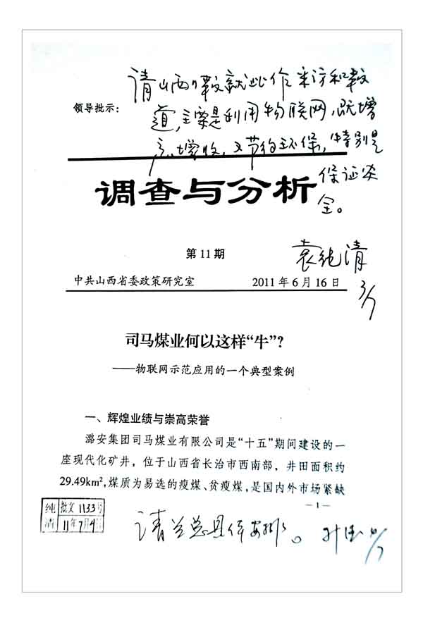2011年4月,山西省委书记袁纯清对司马煤业的物联网技术做出重要批示:“请《山西日报》就此作采访和报道,主要是利用物联网,既增产增效,又节约环保,特别是保证安全。”7月,《山西日报》头版头条刊发长篇通讯《司马奇迹》,全面介绍了司马煤业的物联网技术,“司马奇迹”由此得名。
