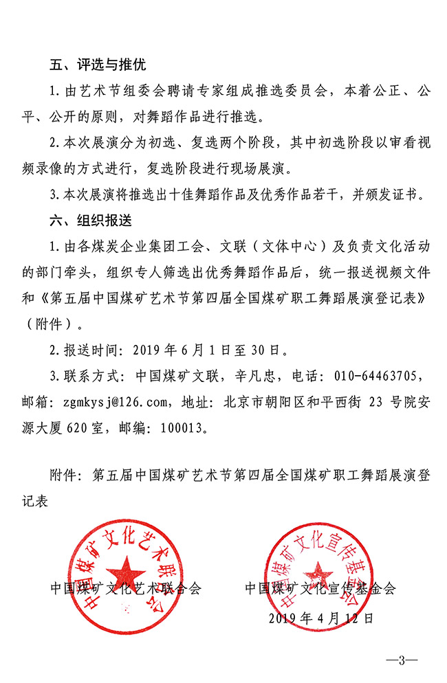关于举办第五届中国煤矿艺术节第四届全国煤矿职工舞蹈展演的通知 来源:中国煤矿文联 作者: 时间:2019-04-17 【字体:小 大】 附件:关于举办第五届中国煤矿艺术节第四届全国煤矿职工舞蹈展演的通知(PDF版)第五届中国煤矿艺术节第四届全国煤矿职工舞蹈展演登记表 智能标签: 中国煤矿文联 相关内容 分享到: 【打印正文】