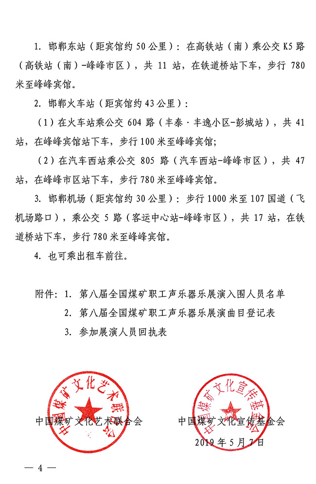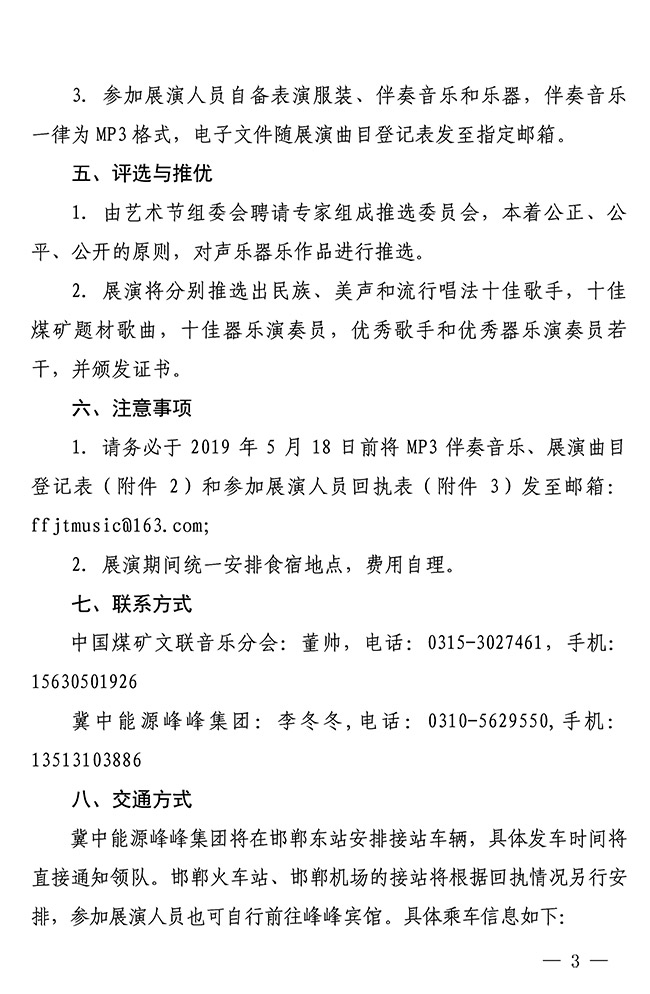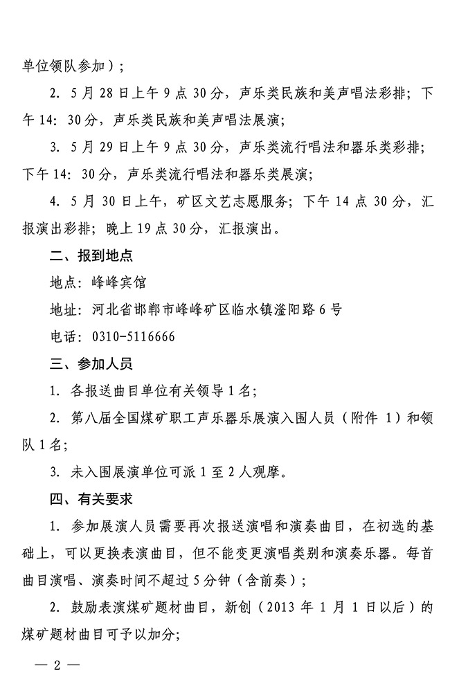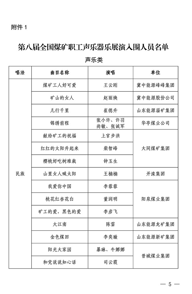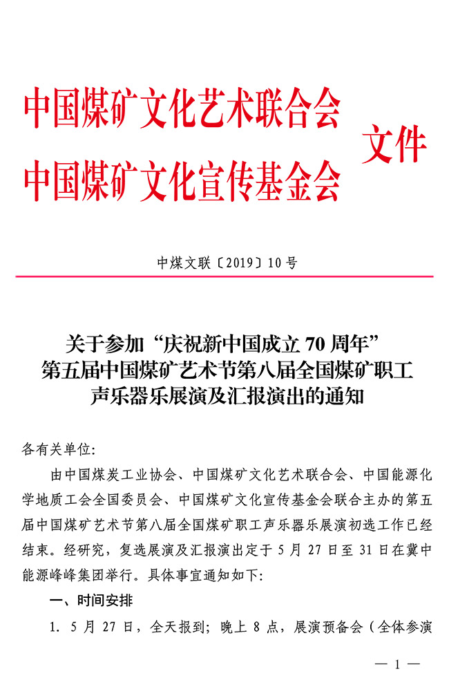 关于参加第八届全国煤矿职工声乐器乐展演及汇报演出的通知 来源:中国煤矿文联 作者: 时间:2019-05-09 【字体:小 大】 附件:1.关于参加“庆祝新中国成立70周年” 第五届中国煤矿艺术节第八届全国煤矿职工声乐器乐展演及汇报演出的通知(PDF版、附件1)2.第八届全国煤矿职工声乐器乐展演曲目登记表3.参加展演人员回执表 智能标签: 第五届中国煤矿艺术节 相关内容 分享到: 【打印正文】