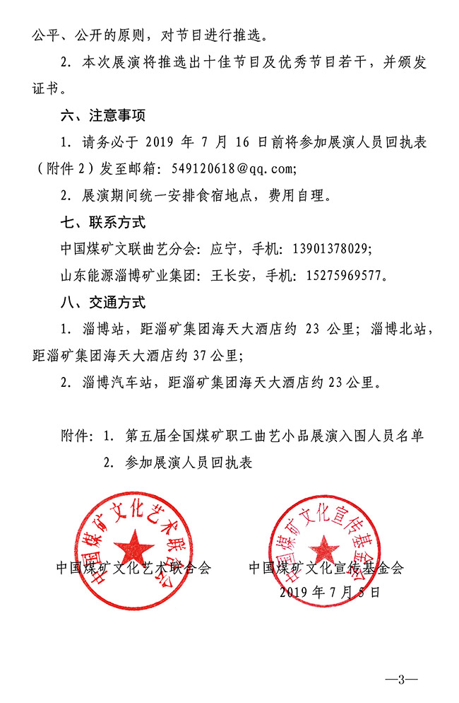 关于参加第五届全国煤矿职工曲艺小品展演及汇报演出的通知 来源:中国煤矿文联 作者: 时间:2019-07-10 【字体:小 大】 附件:• 关于参加“庆祝新中国成立70周年”第五届中国煤矿艺术节“山东能源杯”第五届全国煤矿职工曲艺小品展演及汇报演出的通知(PDF版,含附件1)• 参加展演人员回执表(附件2) 智能标签: 中国煤矿文联 相关内容 分享到: 【打印正文】