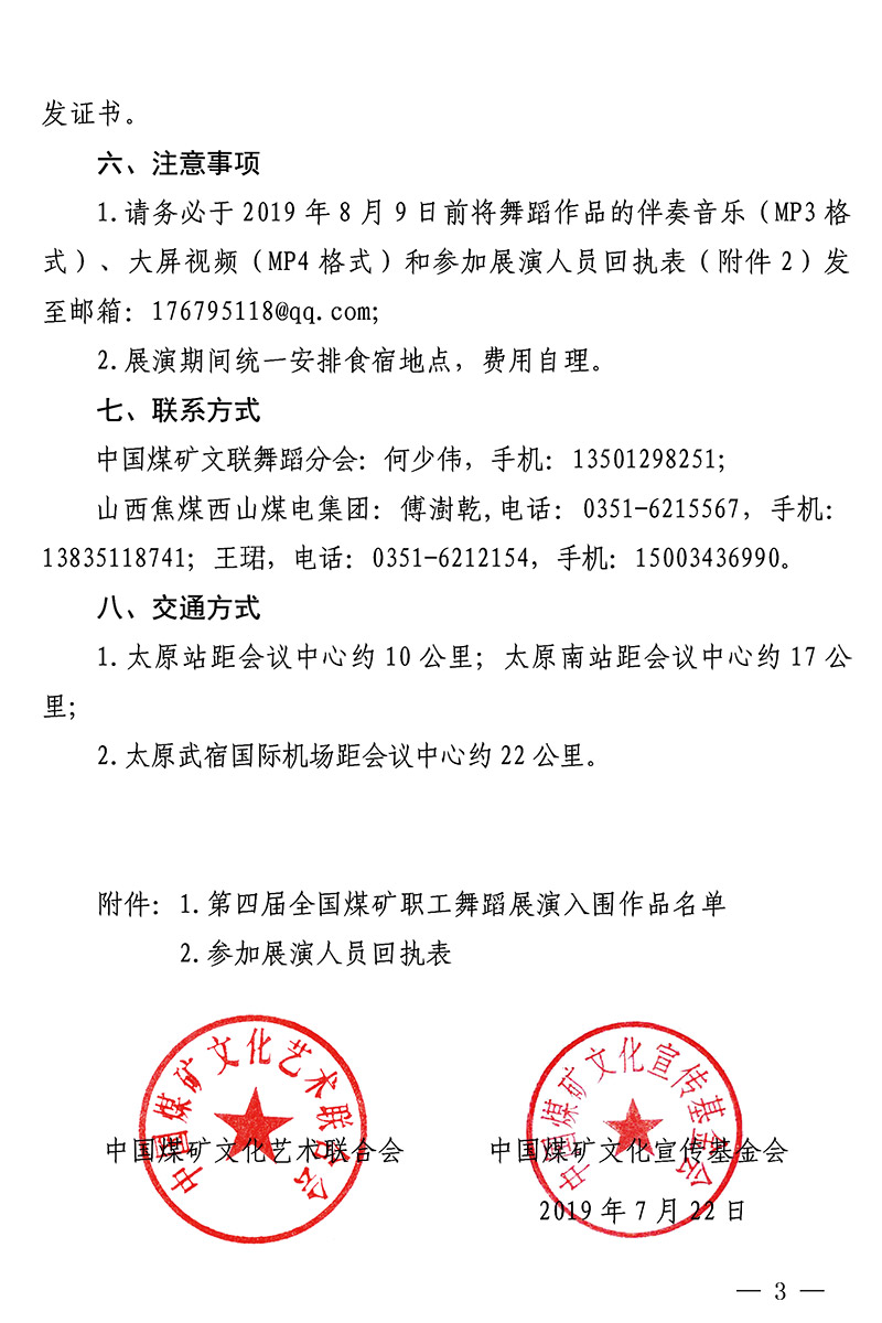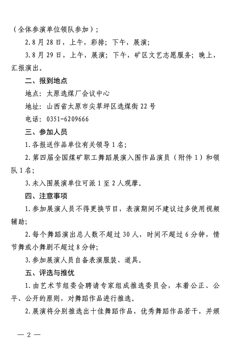 关于参加第四届全国煤矿职工舞蹈展演及汇报演出的通知 来源:中国煤矿文联 作者: 时间:2019-07-26 【字体:小 大】 附件:· 关于参加“庆祝新中国成立70周年”第五届中国煤矿艺术节“山西焦煤杯”第四届全国煤矿职工舞蹈展演及汇报演出的通知(PDF版,含附件1)·参加展演人员回执表(附件2) 智能标签: 中国煤矿文联 中国煤矿艺术节 相关内容 分享到: 【打印正文】