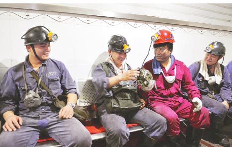 陪我们这几天下井、写生的是付村煤矿工会主席杨爱民,他家四代都是矿工,从他身上能领略到社会发展的脚步和新时代的风采。他爷爷是第一代矿工,亲历了枣庄煤矿的发展初期,那时中国山东刚刚有了重型工业的矿业开采,是中国由封建社会向工业社会转型百年历程的开始。他父亲经历了抗战、铁道游击队、煤城怒火等血与火的岁月。他是在新中国诞生不久后出生,随着共和国的发展而成长起来的第一代矿工,由一个普通的矿工成长为矿领导,并且是做思想及组织工作的领导,有一种当家做主人的意味在其中。他为人豪爽、豁达,又不失细腻、智慧,说到自己的儿子这新一代的矿工时,他非常自豪地说:他们就更享福了,无论矿工的工作条件、工作环境、工作强度,还是矿工的政治待遇、生活待遇都发生了翻天覆地的变化。现在是地上花园、地下工厂,洗浴有如城市大浴池,吃饭可超过时下大酒店,采煤作业机械化、控制电子化,这和爷爷辈、父辈们的光身下井、匍匐前行、手工刨煤、人工拉煤,与‘下去不保命,上来一身黑’的工作条件比,真是今昔两重天了。但矿工们每天下井5至800米进行作业,其意外风险和隐患还是存在的,这一行当仍是一个高危的行业,所以他们把抓安全生产作为头等大事,国务院规定全国矿业单位的矿级领导都要轮流带班与工人同时下井、升井。他是副矿级领导,每月在矿领导轮班中有8天与工人们一起下井工作,每次带班下井都要在井下工作8个小时。我们去付村矿山的4天里,恰逢他带班,一天没见他,事后才知道了这些故事。