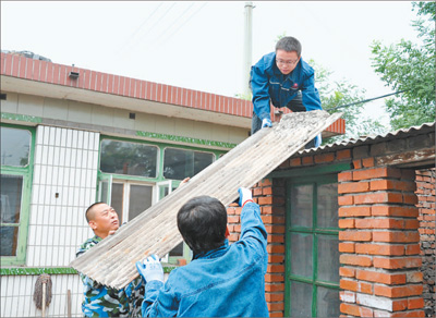 赵奋魁(上)帮助职工修房子。(资料图片)