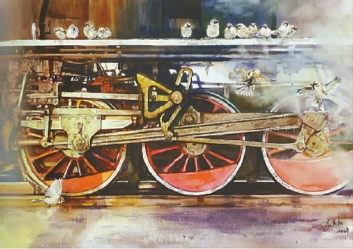 在展览中还能看到煤矿人记忆中留存的煤矿发展的历史印记:可春一的中国画《不能忘记》里锈迹斑斑的火车,赵学峰《丰碑》里的“功勋号”火车,王春涛、侯镇家共同创作的《蒸汽时代》里的“SY0888”火车和电镐挖掘机以及高景权的水彩画《历程·印记》中小鸟栖息的火车轮的特写……无声地诉说着它们的丰功伟绩。阜新矿业集团的孙永光创作的中国画《情系煤海》生动重现了昔日亚洲第一大露天煤矿——阜新海州露天矿的采矿景象,画面中烟尘滚滚,电镐挖掘机正忙碌运转。王春涛、侯镇家的中国画《蒸汽时代》也展示了电镐挖掘机。曾是电镐司机的王春涛介绍到:“最早采矿的露天四大机械就是火车、电镐挖掘机、电铲和钩机,我们画的电镐挖掘机和第三套人民币5元背面图案中的电镐挖掘机是同一型号。”