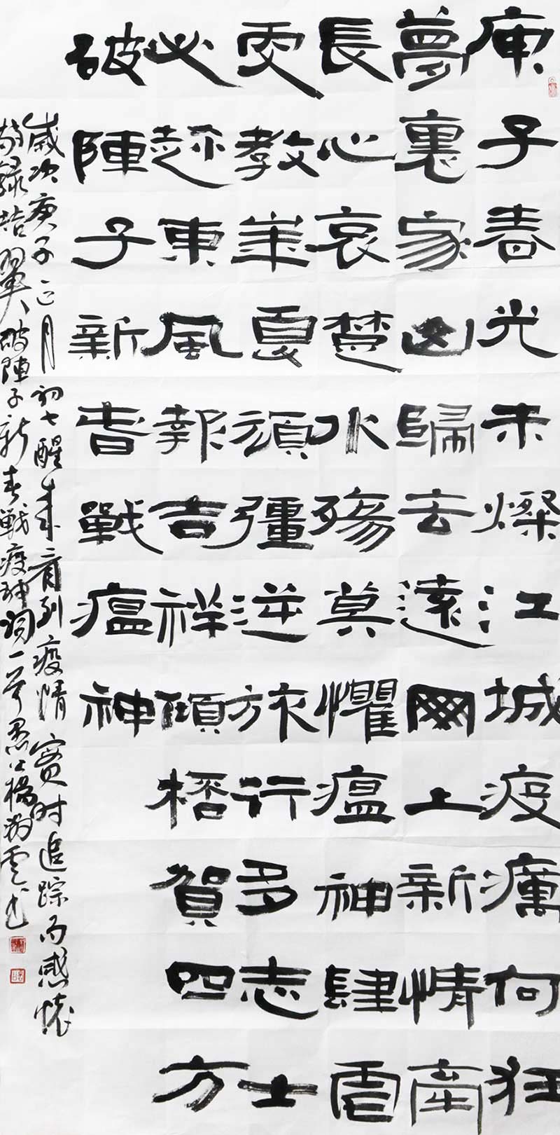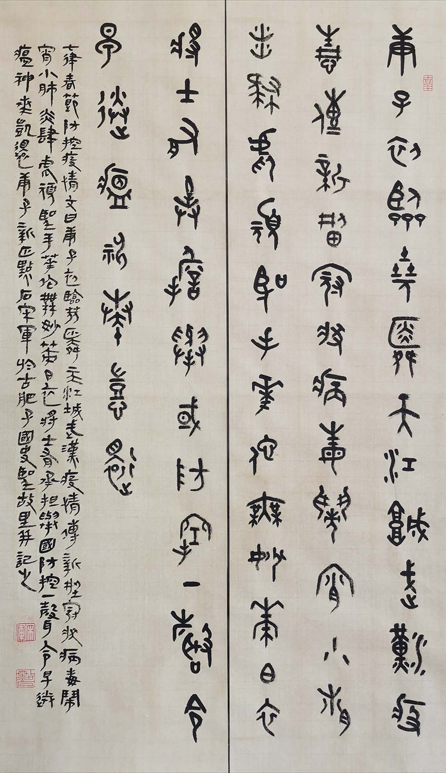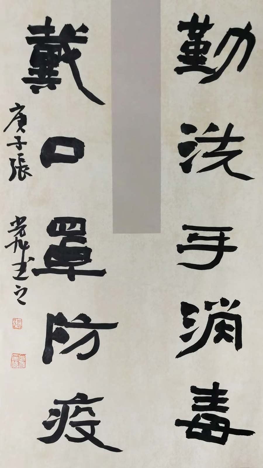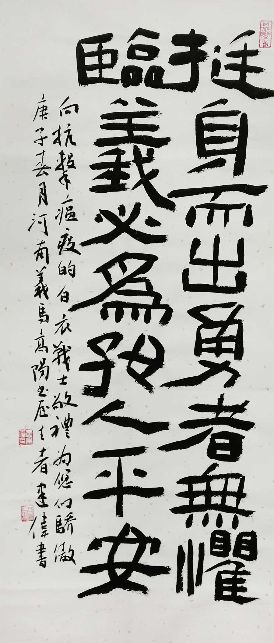 庚子新春,一场来势汹汹的新型冠状病毒感染的肺炎疫情在全国蔓延。面对疫情,习近平总书记作出重要指示,要求“广泛动员群众、组织群众、凝聚群众。紧紧依靠人民群众坚决打赢疫情防控阻击战”。在武汉、在全国各地,无数奔赴在疫情一线的工作人员同舟共济、众志成城,冒着各种风险坚守岗位,投身于这场必须打赢的疫情防控狙击战。在这场抗击疫情的战斗中,文艺工作者不能缺席。中国煤矿文联迅速组织全行业文艺工作者积极行动起来,为坚决遏制疫情蔓延势头、打赢疫情防控阻击战鼓与呼,创作出一大批各种形式的文艺作品,鼓舞全民士气,致敬白衣天使,慰问病患同胞,传递人间真情,弘扬社会正能量。中国煤矿书法家协会迅速行动起来,组织煤矿书法家,用心研墨,以爱为纸,将自己的创作激情,化作了对疫情的关切之情,两天时间创作了数百件鼓舞士气,振奋精神的书法、篆刻作品。点画间传达了550万煤矿工人声援武汉,抗击疫情的信心和决心,表达了对江城武汉的祈福、对伟大祖国的祝愿。