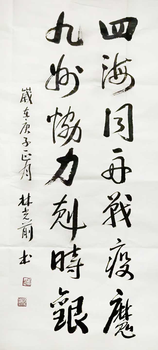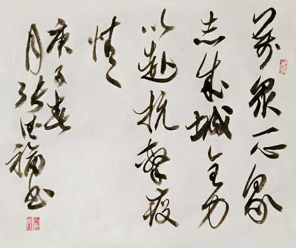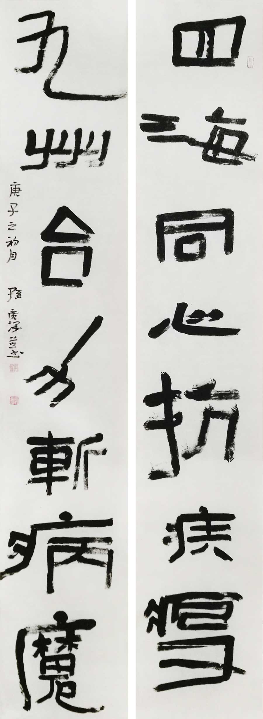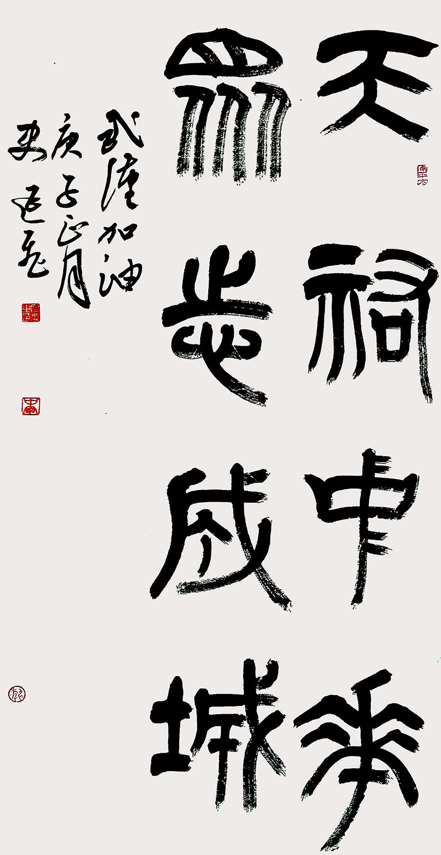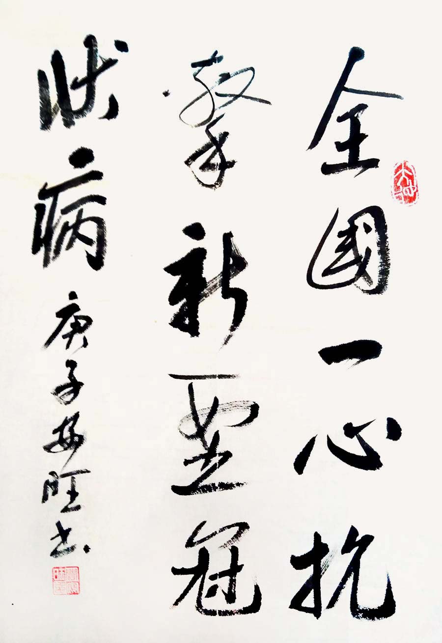 庚子新春,一场来势汹汹的新型冠状病毒感染的肺炎疫情在全国蔓延。面对疫情,习近平总书记作出重要指示,要求“广泛动员群众、组织群众、凝聚群众。紧紧依靠人民群众坚决打赢疫情防控阻击战”。在武汉、在全国各地,无数奔赴在疫情一线的工作人员同舟共济、众志成城,冒着各种风险坚守岗位,投身于这场必须打赢的疫情防控狙击战。在这场抗击疫情的战斗中,文艺工作者不能缺席。中国煤矿文联迅速组织全行业文艺工作者积极行动起来,为坚决遏制疫情蔓延势头、打赢疫情防控阻击战鼓与呼,创作出一大批各种形式的文艺作品,鼓舞全民士气,致敬白衣天使,慰问病患同胞,传递人间真情,弘扬社会正能量。中国煤矿书法家协会迅速行动起来,组织煤矿书法家,用心研墨,以爱为纸,将自己的创作激情,化作了对疫情的关切之情,两天时间创作了数百件鼓舞士气,振奋精神的书法、篆刻作品。点画间传达了550万煤矿工人声援武汉,抗击疫情的信心和决心,表达了对江城武汉的祈福、对伟大祖国的祝愿。