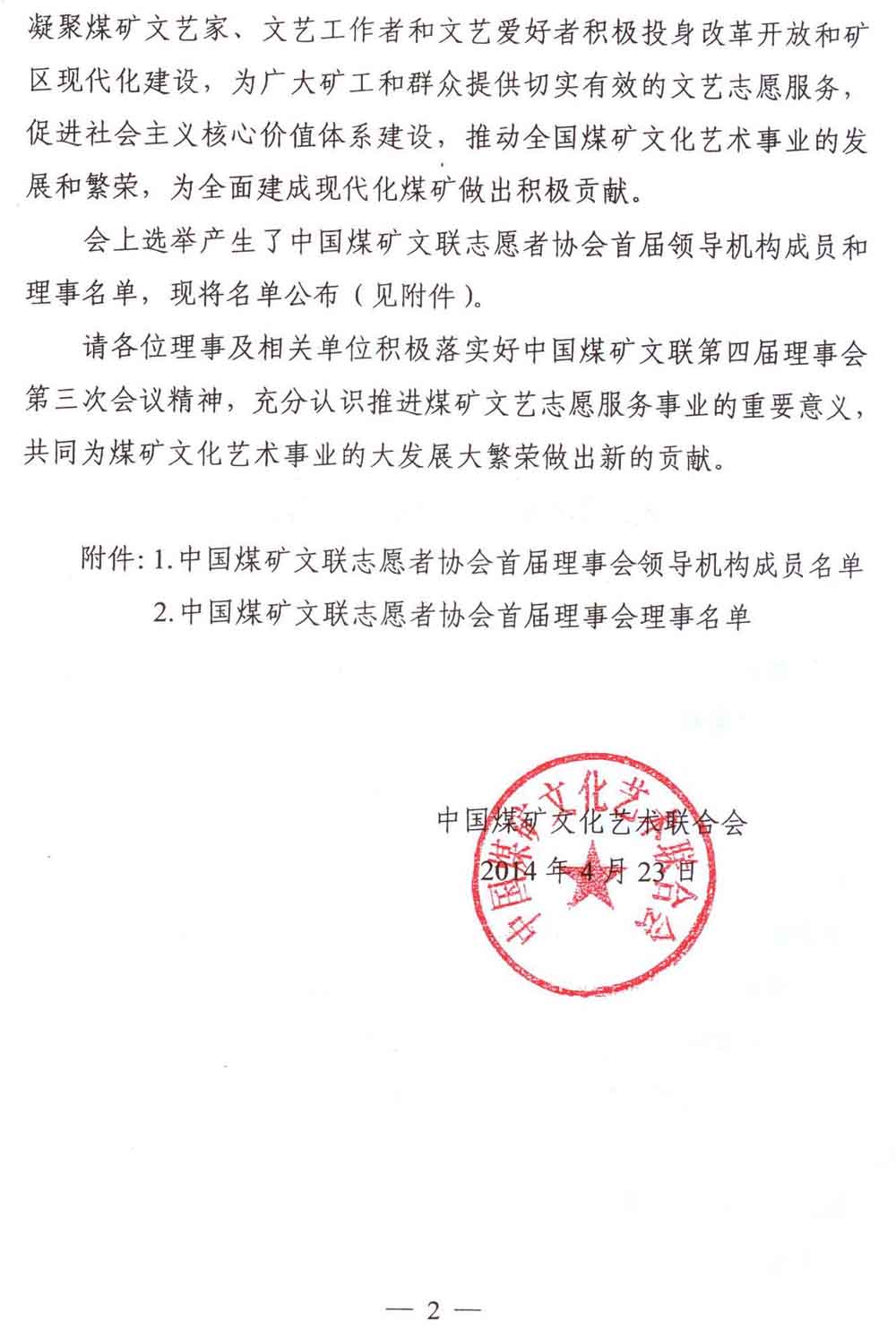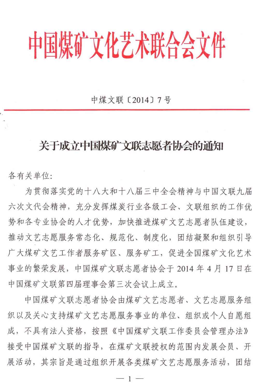 关于成立中国煤矿文联志愿者协会的通知 来源:中国煤矿文化网 作者:煤矿文联 时间:2014-05-19 【字体:小 大】 附件: 1.中国煤矿文联志愿者协会首届理事会领导机构成员名单 2.中国煤矿文联志愿者协会首届理事会理事名单 分享到: 【打印正文】